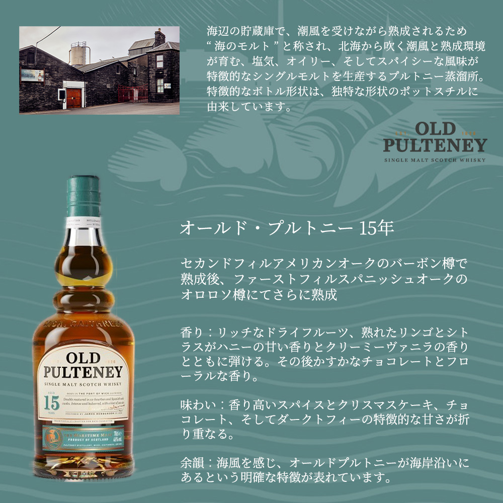 | ■商品説明 | 1826年スコットランド北部ハイランドの港町ウィックに創業した、最も古い蒸溜所の1つ!!プルトニー蒸溜所!!最北端に近い蒸留所でかつてニシン漁で栄えた町で、現在も海の文化が根付いています!!海辺の貯蔵庫で、潮風を受けながら熟成されるため“海のモルト”と称され、北海から吹く潮風と熟成環境が育む、塩気、オイリー、そしてスパイシーな風味が特徴的なシングルモルトを生産しています!!特徴的なボトル形状は、独特な形状のポットスチルに由来しています!!シングルモルト オールドプルトニー 15年!!はセカンドフィルアメリカンオークのバーボン樽で熟成後、ファーストフィルスパニッシュオークのオロロソ樽にてさらに熟成!!リッチアンバーカラー!!濃厚でバランスのとれた香り!!リッチなドライフルーツ、熟れたリンゴとシトラスがハニーの甘い香りとクリーミーヴァニラの香りとともに弾ける!!その後かすかなチョコレートとフローラルな香り!!味わいは香り高いスパイスとクリスマスケーキ、チョコレート、そしてダークトフィーの特徴的な甘さが折り重なる!!フィニッシュには海風を感じ、オールドプルトニーが海岸沿いにあるという明確な特徴が表れています!! |