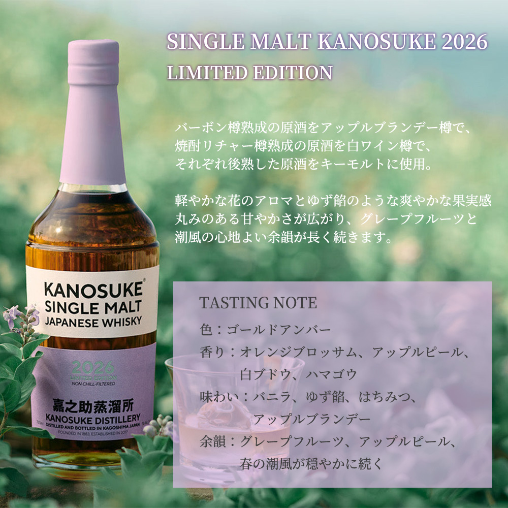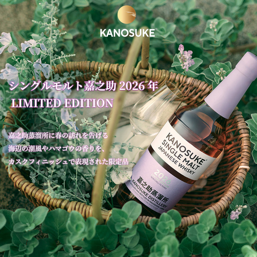 | ■商品説明 | 鹿児島の地からジャパニーズウイスキーの魅力を最大限引き出し、高品質なウイスキー造りを行っているベストジャパニーズクラフトディスティラリーオブザイヤーを受賞した嘉之助蒸留所!!より嘉之助蒸溜所に春の訪れを告げる海辺の潮風やハマゴウの香りを、カスクフィニッシュで表現された限定品!!嘉之助シングルモルト 2026 LIMITED EDITION!!限定入荷!!バーボン樽熟成の原酒をアップルブランデー樽で、焼酎リチャー樽熟成の原酒を白ワイン樽で、それぞれ後熟した原酒をキーモルトに使用!!軽やかな花のアロマとゆず餡のような爽やかな果実感丸みのある甘やかさが広がり、グレープフルーツと潮風の心地よい余韻が長く続きます!! |