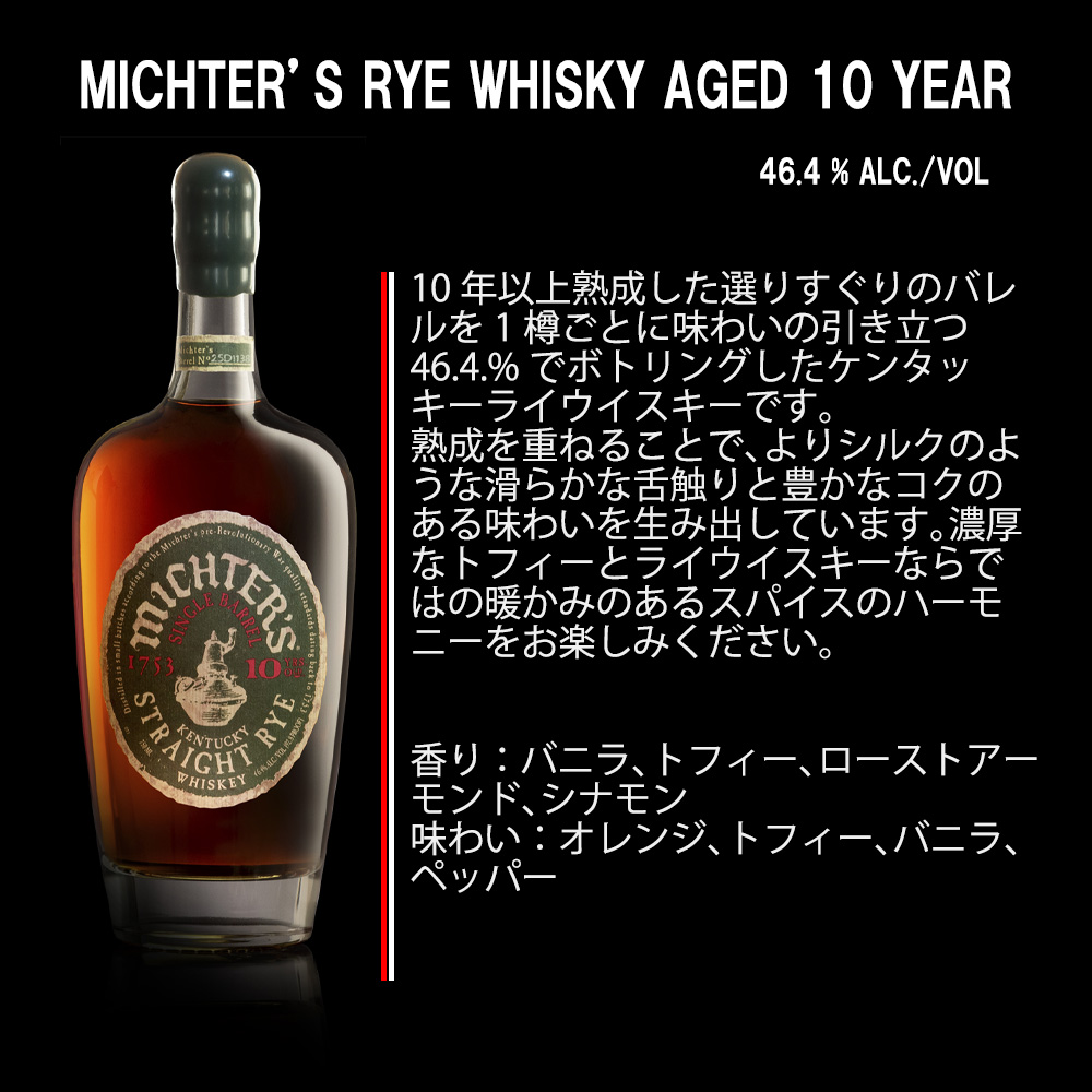 | ■英名 | MICHTER’S RYE WHISKY AGED 10 YEAR SINGLE BARREL KENTUCKY STRAIGHT BOURBON WHISKY 700ml 46.4% |