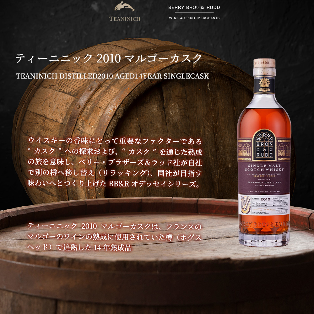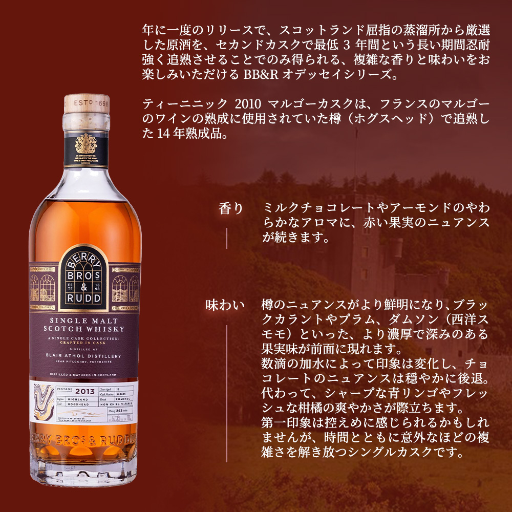 | ■商品説明 | 初入荷!!シングルカスクのカスクストレングスボトリング!!BB&Rオデッセイシリーズ!! ウイスキーの香味にとって重要なファクターである“カスク”への探求および、“カスク”を通じた熟成の旅を意味し、ベリー・ブラザーズ&ラッド社が自社で別の樽へ移し替え(リラッキング)、同社が目指す味わいへとつくり上げたウイスキーのシリーズ!!年に一度のリリースで、スコットランド屈指の蒸溜所から厳選した原酒を、セカンドカスクで最低3年間という長い期間忍耐強く追熟させることでのみ得られる、複雑な香りと味わいをお楽しみいただけるシリーズ!! ティーニニック2010マルゴーカスクは、フランスのマルゴーのワインの熟成に使用されていた樽(ホグスヘッド)で追熟した14年熟成品!! 香りは、ミルクチョコレートやアーモンドのやわらかなアロマに、赤い果実のニュアンスが続きます!!口に含むと、樽のニュアンスがより鮮明になり、ブラックカラントやプラム、ダムソン(西洋スモモ)といった、より濃厚で深みのある果実味が前面に現れます!!数滴の加水によって印象は変化し、チョコレートのニュアンスは穏やかに後退!!代わって、シャープな青リンゴやフレッシュな柑橘の爽やかさが際立ちます!!第一印象は控えめに感じられるかもしれませんが、時間とともに意外なほどの複雑さを解き放つシングルカスクです!! |