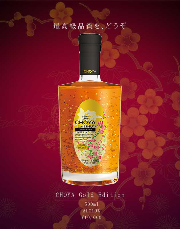 CHOYA チョーヤ ゴールドエディション 金箔入り アルコール度数:19% 金箔入り 最高級梅酒。 厳選した大粒の紀州産南高梅を100%使用し、梅の味を引き立たせるようにブレンドしたフランス・コニャック地方のブランデーのみで漬け込んだ当社最高級の梅酒。南高梅の爽やかな酸味とブランデーのまろやかな風味がマッチした、華やかな香りと味わいをお楽しみいただけます。 金箔を使用することで梅の花が舞う様子を表現し、見た目も華やかに演出。 化粧箱入りなので、大切な方への贈り物にも最適です。