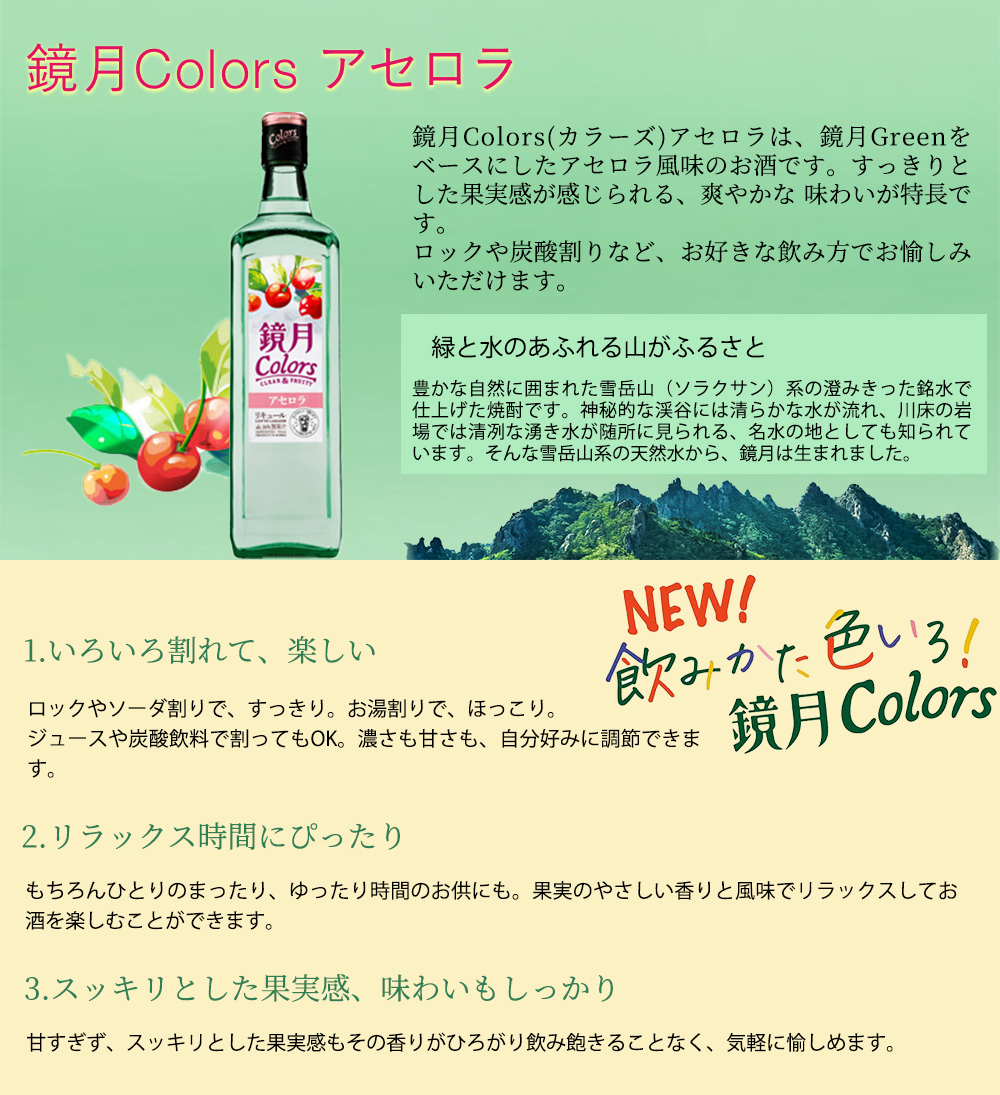 | ■商品説明 | 鏡月Colors(カラーズ)アセロラは、鏡月Greenをベースにしたアセロラ風味のお酒です!!すっきりとした果実感が感じられる、爽やかな味わいが特長です!!ロックや炭酸割りなど、お好きな飲み方でお愉しみいただけます!! |