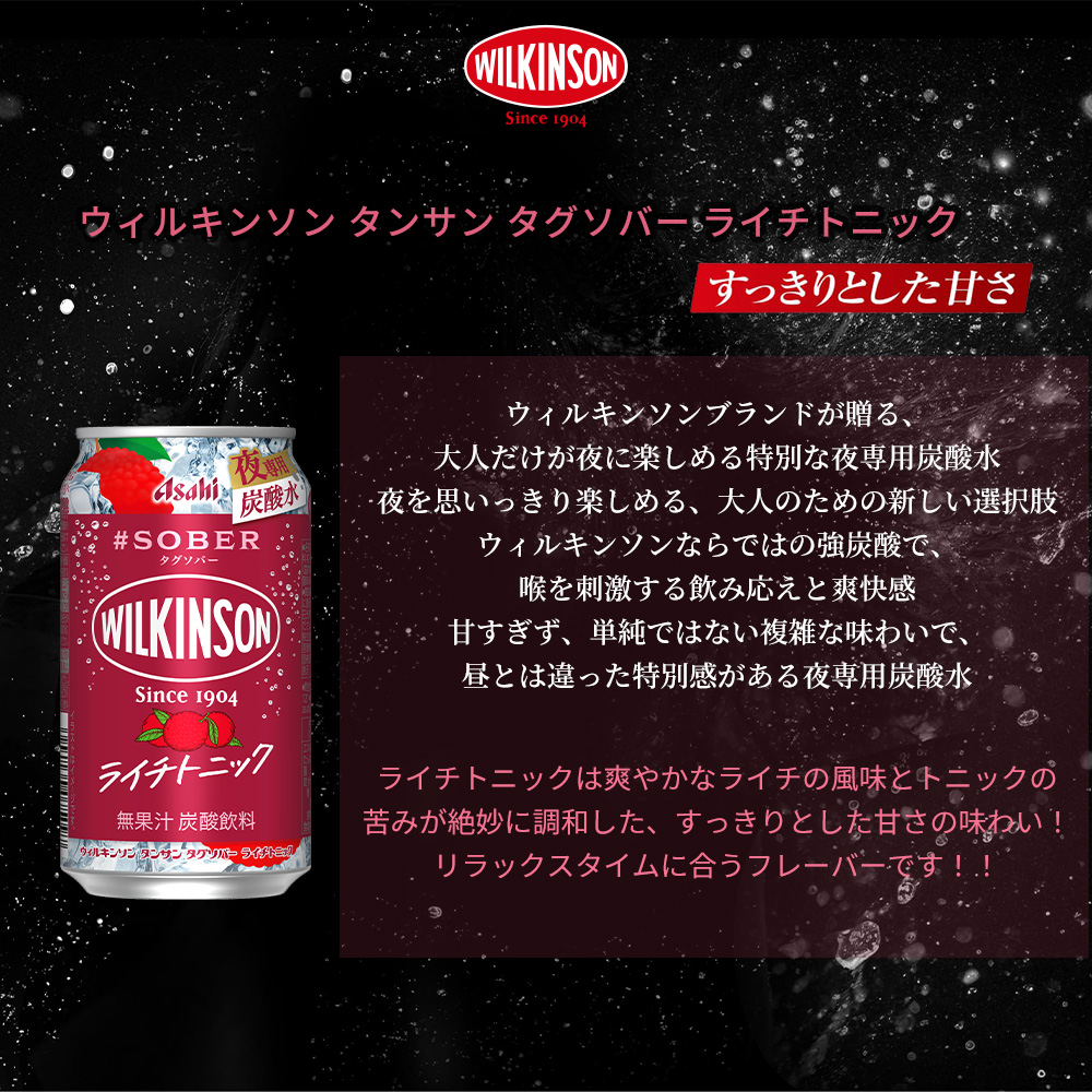 | ■商品説明 | ウィルキンソンブランドが贈る、大人だけが夜に楽しめる特別な夜専用炭酸水!!夜を思いっきり楽しめる、大人のための新しい選択肢!!ウィルキンソンならではの強炭酸で、喉を刺激する飲み応えと爽快感!!甘すぎず、単純ではない複雑な味わいで、昼とは違った特別感がある夜専用炭酸水!!ライチトニックは爽やかなライチの風味とトニックの苦みが絶妙に調和した、すっきりとした甘さの味わい!!リラックスタイムに合うフレーバーです!! |