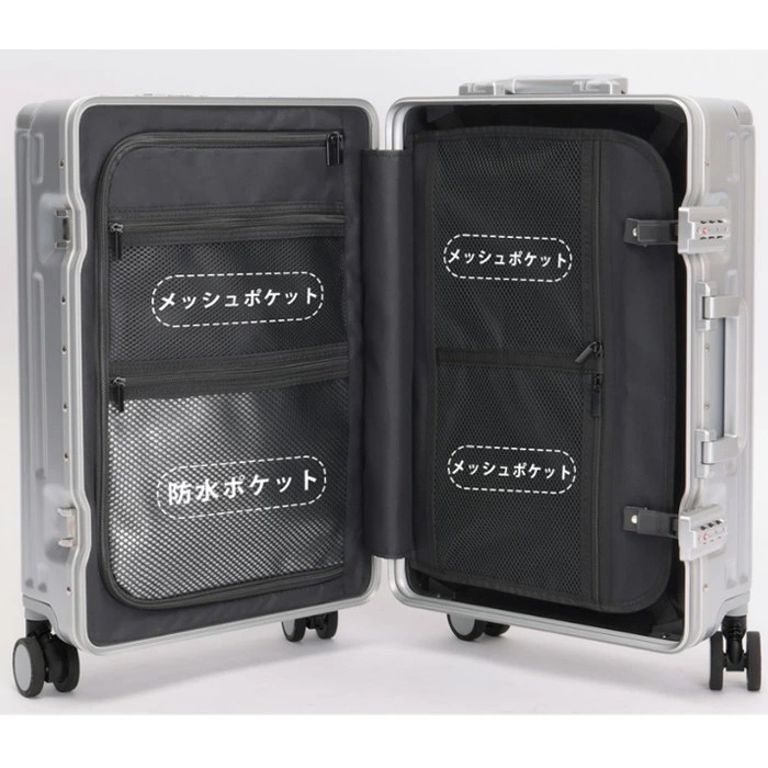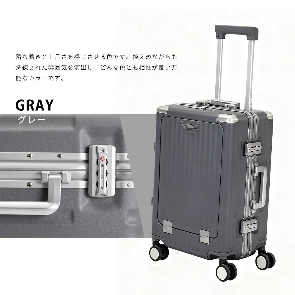【フロントオープン&USB充電ポート付き】立てたまま荷物の出し入れができる便利なフロントオープンスーツケースです。15.7インチまでパソコンやタブレット、パスポートなど荷物に合わせた細かなポケットがあり、空港や新幹線の中、旅の途中でも、前ポケットから出したいものを簡単に取り出すことができ、子連れの方やビジネスシーンでも活躍しています。便利なUSB充電ポート付き、場所を選ばずいつでもどこでも移動しながら効率よく充電ができます。 【カップホルダー+サイドに荷物掛け】開閉式バックにはカップホルダーを設けており、ティーメーカー、ボトル、カップ、冷たい飲み物などを簡単に出し入れすることを可能にしました。キャリーケースのボディ側面に手提げ袋など掛けられるフックを搭載しています。外出中増えがちな荷物を、手持ちから解放してくれる便利機能です。 【2段階調節キャリーバー】360度回転可能の9輪ダブルキャスターは、静音と耐久性抜群で、凸凹道でもスムーズに走ることができます。また、ストッパーが付いているため、坂道や電車内などスーツケースを止めたい時に便利です。アルミ製のキャリーバーは2段階に調節が可能で、様々な身長に合わせてスムーズに調整できます。男女問わず子供も利用できます。 【合理的な仕切りデザイン・TSAローク搭載】内部構造は、旅行者のニーズを考慮して設計されています。高品質なポリエステル生地が使用されており、柔らかく快適な手触りを提供します。一目で中身が分かるメッシュポケット、濡れたタオルや化粧品を収納できるウェットポケットなど、小物の整理に便利な設計になっています。欧米基準のTSAロックも装備され、海外旅行にもピッタリ、より便利な旅行へ。TSAロックを使用し、操作簡単、便利でらくらく。※鍵は航空会社検査専用のため本製品には付属しておりません。 【機内持ち込み可能サイズxお得な旅行5点セット】サイズ:W37xD23XH55cm、三辺合計:115cm以内、機内持ち込み可。容量:約39L 重量:約4.5KG 宿泊目安:1~3泊。秋の旅に応援するため、お得な旅行セットを先行販売しております。セット内容:Sサイズスーツケース、トラベルポーチ8点、キャスターカバー、ケーブル、マスク。