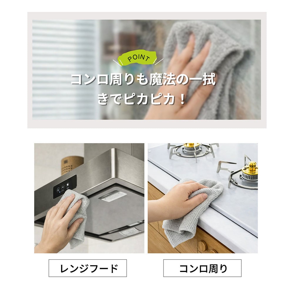 高密度な繊維構造で、水分や油汚れを素早く吸収! 台所やシンク周り、テーブルの拭き掃除もラクラク。跡を残さずスッキリ清潔に。