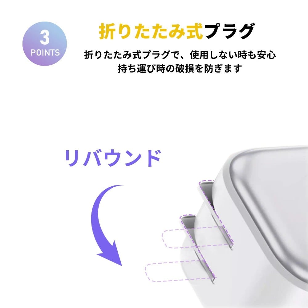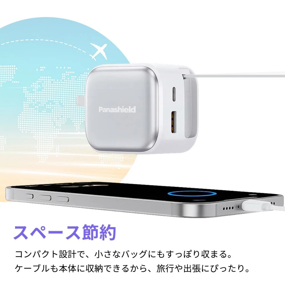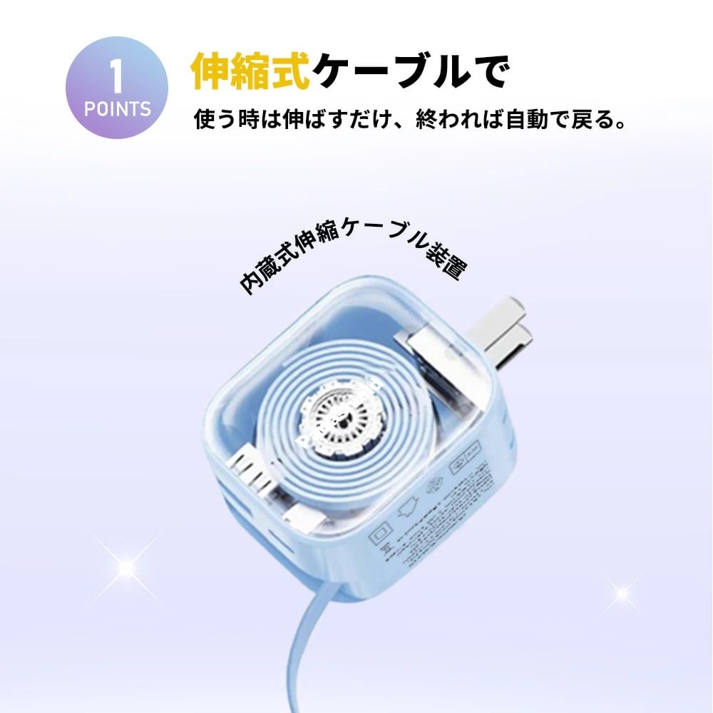 【ケーブル一体型・引っ張るだけで充電】約72cmの伸縮式充電ケーブルを本体に内蔵した「伸縮式ケーブル 35W 急速充電器」です。ケーブルを引っ張るだけでスムーズに充電が開始でき、使用後は自動でコンパクトに巻き取れるため、ケーブルの絡まりや紛失の心配がありません。机の上もすっきり整えられます。さらに高精度回転軸を採用し、10,000回以上の引っ張り試験をクリアした高耐久設計。静音で滑らかな操作感も魅力で、オフィス、学校、旅行や外出先でもスマートに活躍します。 【最大35W出力&3台同時充電】PD対応の最大35W出力により、充電速度が大幅に向上。さまざまなデバイスを素早く充電でき、時間を節約できます。3ポート(USB-C×2+USB-A×1)のポート構成で、最大3台のデバイスを同時に急速充電可能。さらにスマート出力調整機能を搭載し、接続された機器に応じて最適な電力を自動で供給します。忙しい朝や外出前の短時間でも、効率よく充電を完了できます。 【GaN技術採用&8重保護機能】次世代GaN(窒化ガリウム)技術とインテリジェントコアチップを搭載し、高効率な電力変換と安定した電流供給を実現。さらに、過電流・過電圧・過熱・短絡・過負荷・逆電流など、計8つの安全保護機能を備えており、日常の使用はもちろん、夜間や長時間の充電でも安心してお使いいただけます。 【折りたたみ式プラグ・持ち運び便利】本体には折りたたみ式プラグを採用。未使用時は本体にすっきり収納できるため、バッグやポーチの中でも他の荷物を傷つける心配がありません。手のひらサイズで軽量なコンパクト設計なので、自宅・職場・海外旅行・出張先など、さまざまなシーンで持ち運びやすく、どこでもスマートに使えます。 【幅広い互換性&多機種対応】PD・QCなど多様な急速充電規格に対応し、Apple・Google・Samsung・Sonyをはじめとする主要ブランドの機器に幅広く対応。スマートフォン、iPad、Switch、イヤホン、モバイルバッテリーなど、これ1台でまとめて充電できます。複数のデバイスを持ち歩く方や、ご家族での共有にも最適です。