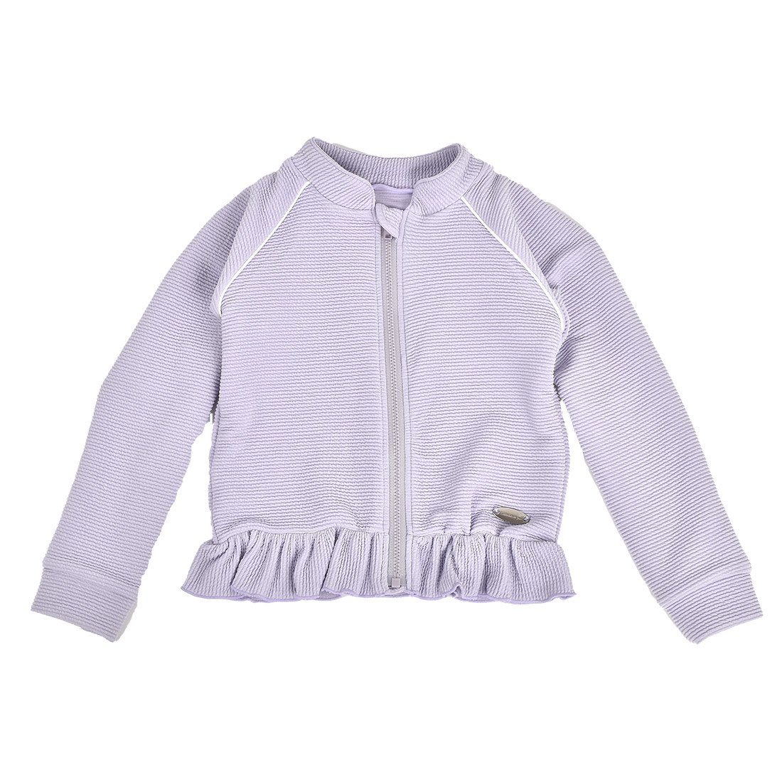 UVプロテクト機能付きのフリルラッシュガード。屋外の視線からお肌をしっかりガードします。裾のフリルデザインが女の子らしく夏の普段使いにもおすすめです。前開きのファスナータイプでサッと羽織れば日焼け止めを塗り直す手間もなく楽ちん♪ポコポコとしたシボ感が可愛い生地で柔らかく伸縮性もバッチリ◎ラベンダーとオフホワイトでどの水着にも合わせやすいカラーです。