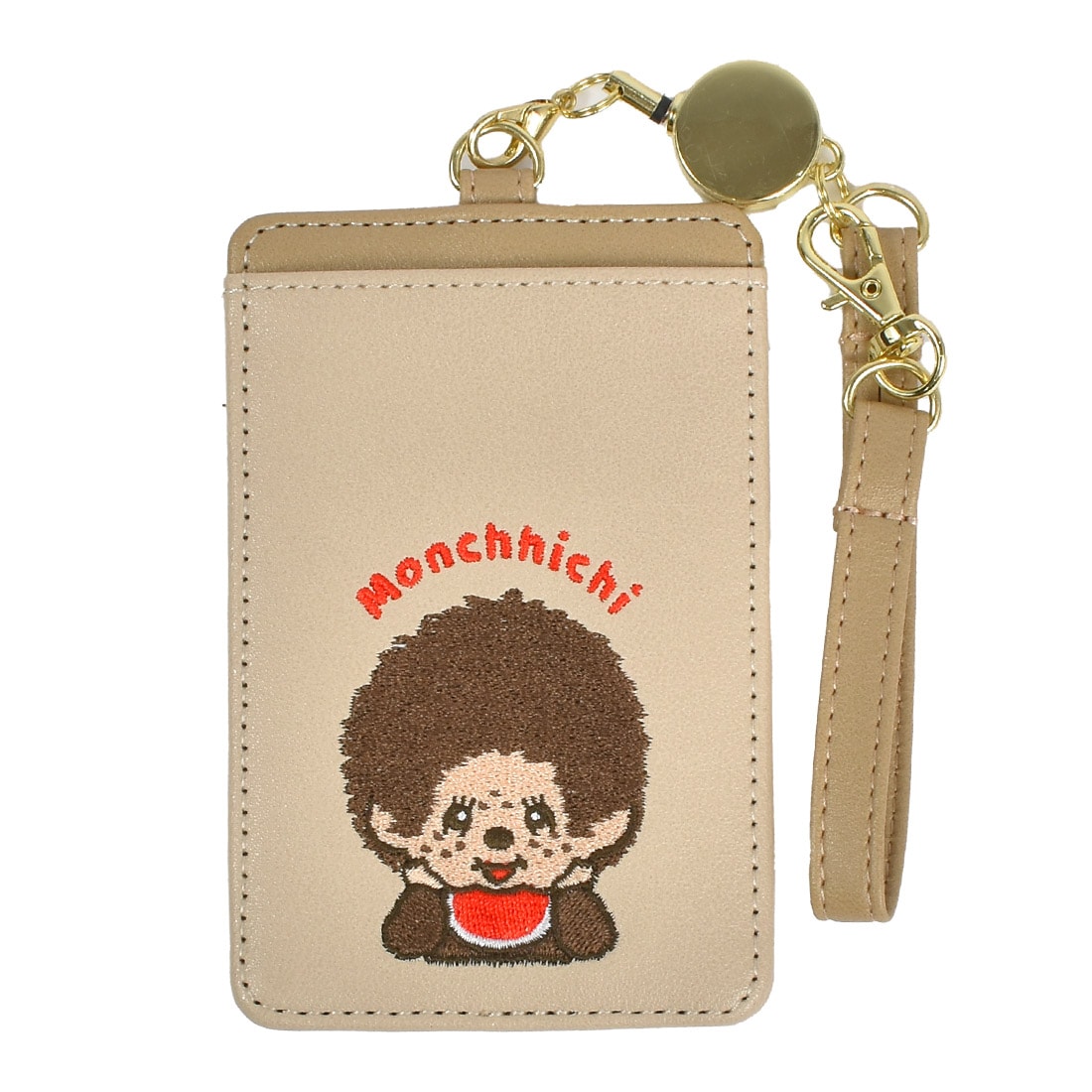 1974年に発売され爆発的ブームを起こしたそばかすが可愛いらしいぬいぐるみモンチッチがパスケースに。便利な伸びるリール付きでカードを2枚収納できます。