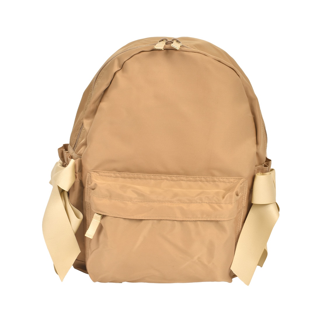 サイドポケットのWリボンがかわいい、デイリーに使いやすいデイパック。お弁当箱もしっかり入るたっぷりマチと両サイドポケット・フロントポケットで収納力もバッチリ◎とっても軽いナイロン素材で、通園・通学やおでかけなど様々なシーンで使えるリュックサックです。