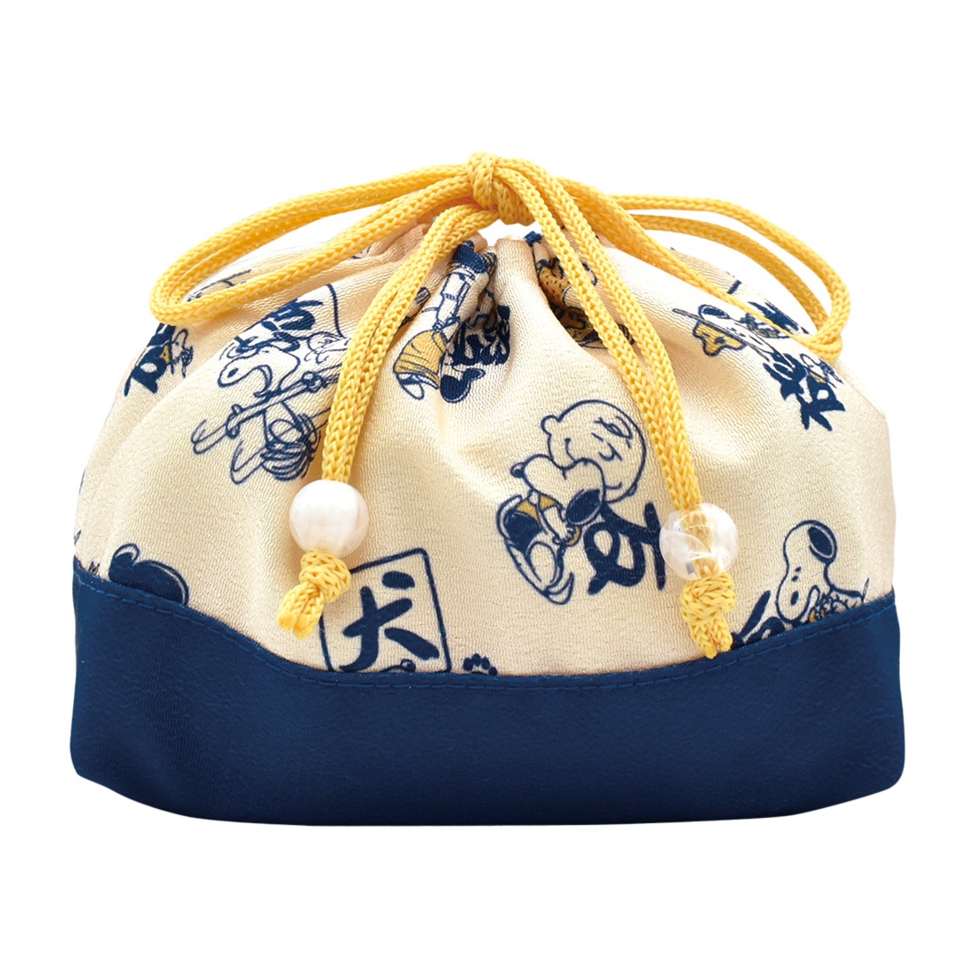 和柄×キャラクターのデザインが可愛い巾着袋。ちりめん生地の風合いがとってもおしゃれ♪お弁当袋やポーチにちょうどいいマチがついた横長の大きめサイズです。