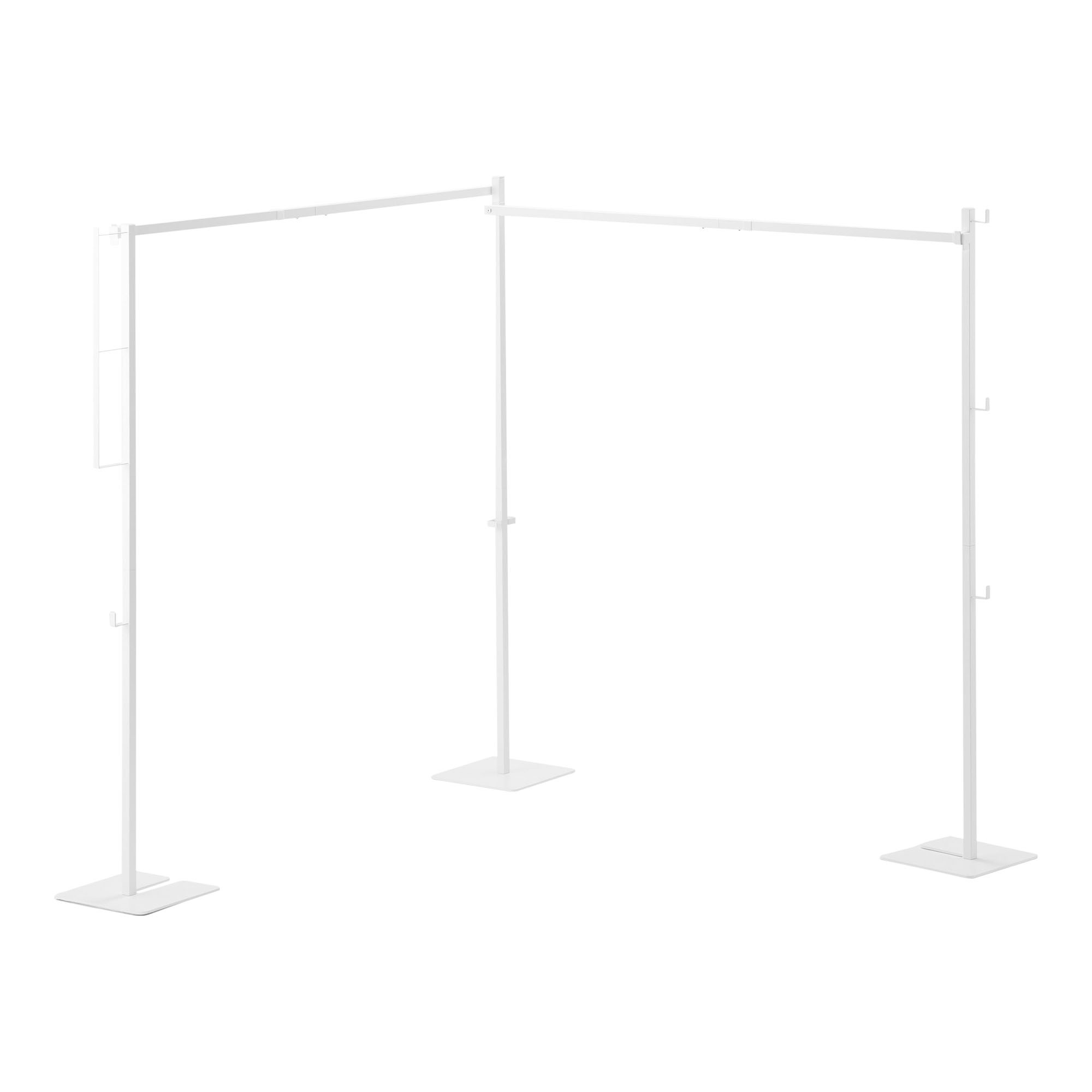 室内での部屋干しに便利な物干しスタンドです。L字型に設置すればお部屋のコーナーを有効活用でき、I字型にすれば空間に合わせて自在にレイアウト可能。幅254cmのワイドサイズで、一度にたくさんの衣類を干せます。サッと広げて簡単に設置でき、使わない時は土台をスライドして折り畳めばコンパクトに収納可能。さらに、洗濯グッズを掛けられるフック付きです。