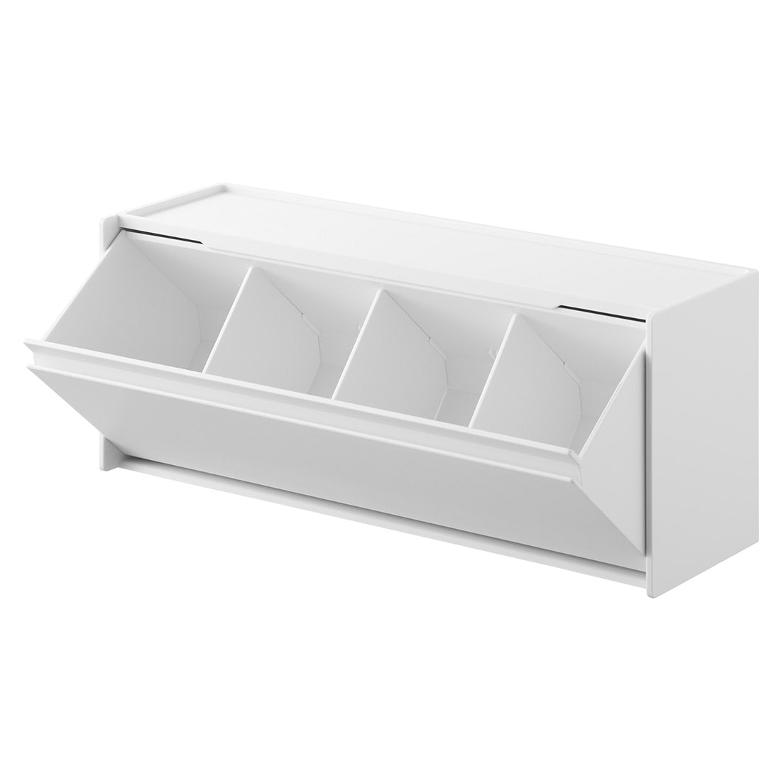 石こうボードピンで壁に付けても置いても使える!洗面小物や化粧品などをスッキリ隠せる収納ケースです。シンプルでスタイリッシュなデザインなので場所を選ばずスマートに設置できます。天板はトレーになっているので小物置きとしても使用可能。ケースはフラップ式なので片手で簡単に開閉でき、整理に便利な可動式の仕切りが3枚付属しています。壁の穴が目立ちにくい石こうボードピンで、浮かせて取り付けられるので衛生的。木ネジでも設置可能。底面にはシリコーンの滑り止めが付いているので、そのまま置いて使用することもできます。スタッキング可能。