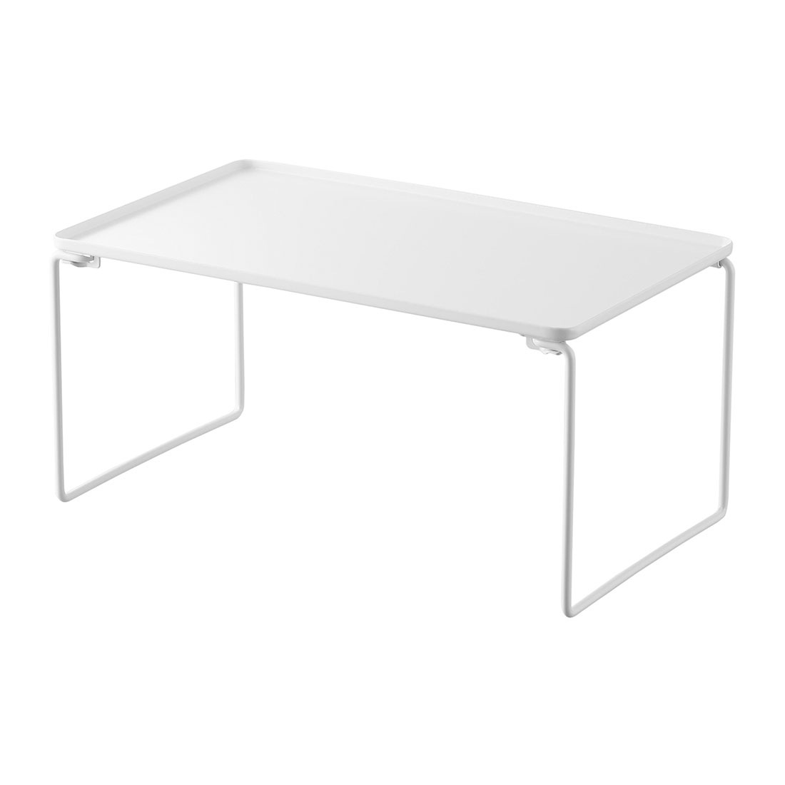 キッチンや洗面所のシンク下のスペースを有効活用。積み重ねても並べても使える棚。シンク下のスペースを無駄なくスッキリ整頓でき、棚はフチ付きなので収納物の落下を防止してくれます。キッチンシンク下では、鍋や収納に使うファイルボックスがスッキリ収まるサイズ感です。シャンプーや洗濯洗剤などのストック収納として、洗面シンク下への設置もおすすめです。使わない時は折り畳んでスリムに収納できます。