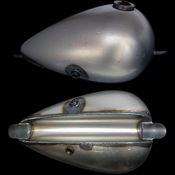 容量:2.2ガロン(約8.8リットル)長さ約390mm(ブラケット含まず)最大幅約240mm 最小幅約800mm 高さ約220mmトンネル(下のえぐれてる所)幅約60~70mm 深さ約85mmガスコックサイズは右側3/8NPT、左側1/4NPT素材:スチールガスキャップはカムタイプのみ適合です。ガスキャップは左右とも右用が対応します。左側のガスキャップ取り付け口は穴が塞がっております。