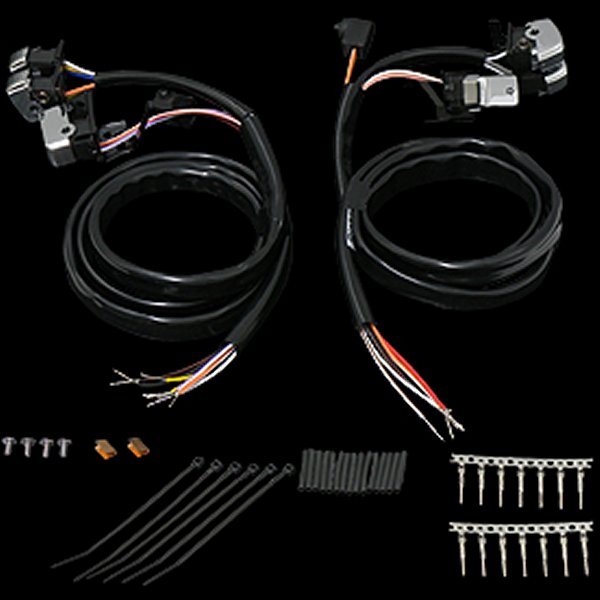07年以降のビッグツインモデルに適合※11年以降ソフテイル、12年以降ダイナおよび、14年以降ツアラー&XL等のBCM搭載モデルは除く。※クルーズコントロール付きは除く。配線長さ約1300mmスイッチ部分:クロームステー部分:ブラック素材:スイッチ部分:プラスチックステー部分:スチール【セット内容】スイッチキット右用×1セット 左用×1セット左右セットです。06年式までのハウジングには使用できませんのでご注意下さい。端子形状はモレックスのコネクターに対応。CAN-BUS配線モデルには適合しませんのでご注意下さい。
