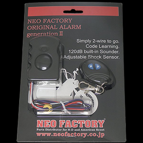 12V車輌(ハーレーに限らず御利用いただけます。)上記画像にてご確認下さいカラー:ブラック素材:プラスチック【セット内容】アラーム本体×1個 専用リモコン(キーホルダー付き)×1個09年までに販売されていた商品番号000047のアラームセット及び000284のリモコンとは互換性がありません。防水加工はしておりませんので、水滴が直接付着する様な場所への取り付けはご遠慮下さい。水銀などの傾斜センサー方式ではございませんので、動作範囲は直接的な振動を感知した際となります。スタンバイ時の消費電力13mmアンペア。リモコンに封入されている電池はテスト用の為、容量が少なくなっています。使用する際には電池を必ずご交換ください。