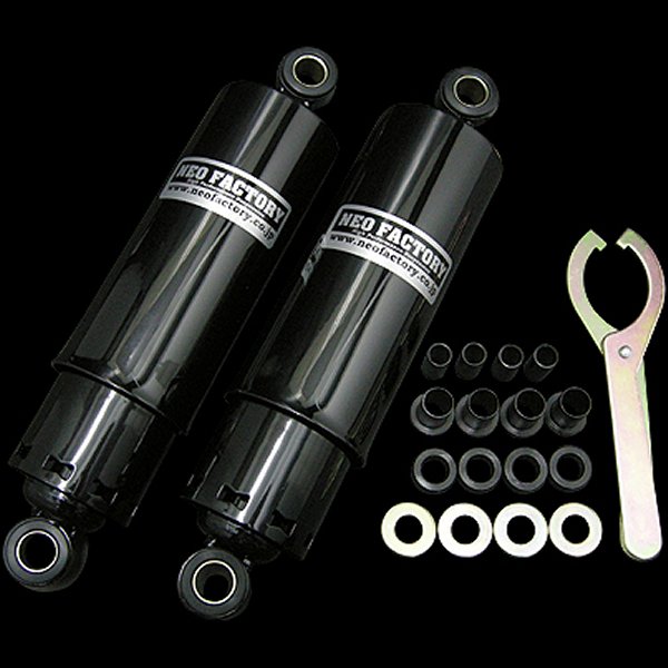 79年-03年 XL82年-94年式 FXR取り付け部芯間:11インチ(約280mm)全長:約310mm太さ(カバー部):約73mm素材:スチール取り付け後、必ずRフェンダーとベルトガードのクリアランスを確認してください。必要に応じてフェンダー、ベルトガードをカットして使用してください。車高が変わるため、サイドスタンドの変更が必要になる可能性があります。汎用品のリアショックト
