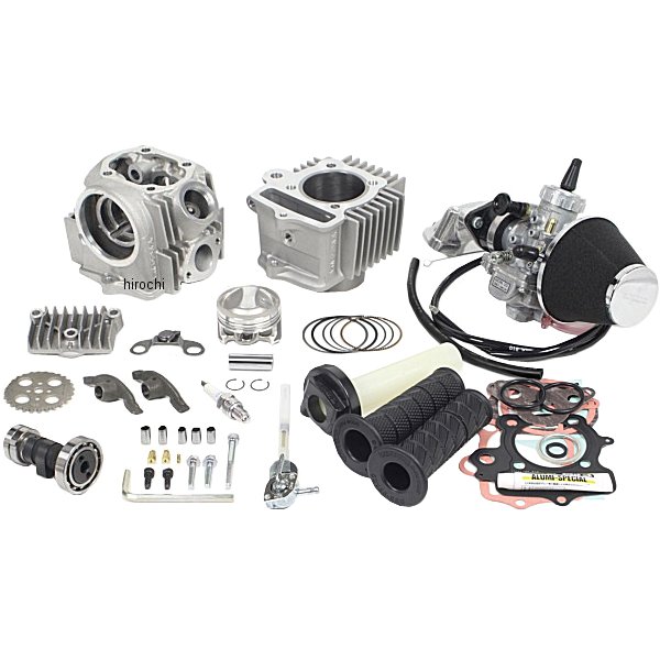 SP武川 17Rステージ+Dコンボキット12V モンキー (Z50J-2000001-)12V モンキー (AB27-1000001-1899999)6V モンキー (Z50J-1600008-1805927)12V ゴリラ (Z50J-2000001-)12V ゴリラ (AB27-1000001-1899999)6V ゴリラ (Z50J-1600008-1805927)【キット内容】・17R-Stage+D ボアアップキット88cc・MIKUNI VM26キャブレターキット・ハイフローフィルター・ハイスロットルセット・スパークプラグ規格:12V-モンキー (Hシリンダー/R-10E/VM26)17Rステージ+Dボアアップキット装着と共に必要となるビッグボアキャブレターの他、スロットルケーブル、ハイフローフィルター、スパークプラグなど、SP武川社推奨パーツが付属したコンボキットです。それぞれ個別で購入するよりも、お買い得価格になっております。【17Rステージ+Dシリンダーヘッド】・ノーマルヘッド形状をベースに大径バルブ インテーク:26mm/エキゾースト:22.5mm を採用。(12Vモンキーノーマルバルブ径はインテーク:19mm/エキゾースト:16mm)・大径バルブに併せて、最適なバルブ挟み角、燃焼室形状、ポート形状を採用したSP武川社オリジナルのシリンダーヘッドです。・ノーマルヘッドのポート径は、インテーク/エキゾースト共に14mmであるのに対し、17Rステージのポート径はインテーク:24.5mm/エキゾースト:19mmと大径化。又、3次元ポート形状を採用し、バルブ・ポートの大径化と相まって、より多くの吸排気ガスをスムーズに流す事を可能としています。・バルブ:(インテーク26mm/エキゾースト22.5mm バルブステムシャフト径4.5mm)・バルブの大径化により、増加する重量をステムシャフトの細軸化とウエスト加工により、最小限の重量増加に留めています。・バルブスプリング:最適なスプリングレートの不等ピッチ(2段ピッチ)シングルバルブスプリングを採用し、高回転時のサージングを抑えます。【オートデコンプレッションカムシャフト】・オートデコンプレッション機能:高圧縮、排気量アップエンジン車でも、軽いキック力でエンジン始動が可能・カムシャフトはR-10E/R-15E/R-20Eの3種類あり、使用用途に合わせて交換し、走行性能を楽しむことが出来ます。・88cc/スカット106cc/106ccキット付属カムシャフト:R-10E【φ52Hシリンダー(アルミ製鉄スリーブシリンダー)】・カブ系エンジン純正シリンダーと外観上は同デザイン(シリンダーの高さは異なる)です。・シリンダー側面にはM5温度センサーの接続が可能となり、別途SP武川社製コンパクトLCDメーター(M5温度センサー付き)、又はサーモメーターのセンサー部分をM5温度センサーに変更することでシリンダー温度の計測が出来ます。【ピストン】・ピストンはスカート部に初期馴染みを良好にするモリブデンコートが施されています。【17R-Stage+D コンボキット88cc】・17Rステージ+Dボアアップキット装着と共に必要となるビッグボアキャブレターの他、スロットルケーブル、ハイフローフィルター、スパークプラグなど、SP武川社推奨パーツが付属したコンボキットです。・それぞれ個別で購入するよりも、お買い得価格になっております。