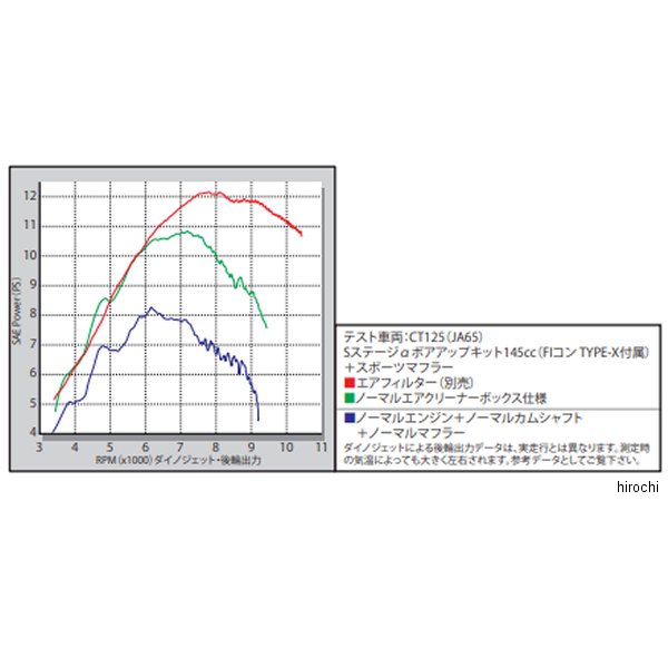 SP武川 S-Stage α ボアアップキット 145ccホンダ CT125/JA65-1100001以降【仕様説明】SステージαボアアップキットはSステージボアアップキットに大容量インジェクター(G-6)、FIコン TYPE-X(インジェクションコントローラー)が付属しています。【 Sステージボアアップキット145cc/スポーツカムシャフト付属】シリンダーとピストンの変更で、排気量をノーマル124ccから145ccに変更出来るボアアップキットです。FIコン TYPE-X(インジェクションコントローラー)と同時装着することで、ノーマルとは異なるトルクフルな出力特性を実現します。シリンダーはアルミ製鉄スリーブシリンダーを採用。ボア径54mm、ストローク63.1mm(ノーマル)、圧縮比11.2:1シリンダーには、SP武川製M5温度センサーの取り付けが可能な為、別途温度計(コンパクトLEDサーモメーターM5温度センサー付き)をご購入いただくことで、シリンダー温度を計測できます。※排気量が125cc以上になる為、原付二種登録では一般公道を走行することは出来ません。競技専用になります。【スポーツカムシャフト/N-10】ノーマルシリンダーヘッドの性能を最大限に引出す最適なプロファイルにより、出力性能が向上します。ノーマルエンジンに装着する事で高回転域の出力が向上します。ノーマルカムシャフトからデコンプパーツを取外し、スポーツカムシャフトに組付けるとオートデコンプレッション仕様になります。【オプショナルパーツ/N-20カムシャフト】使用用途に合わせて交換し、走行性能をお楽しみいただけます。【大容量フューエルインジェクター/G-6】SP武川製ハイコンプピストン・Sステージボアアップキット装着車用の大容量フューエルインジェクターになります。本製品は指定外のエンジン仕様車両に装着しても不調となる場合があります。CT125(JA65-1000001~1099999)で、本製品をノーマル車やSP武川製エンジンパーツ装着車に装着しても性能は向上しません。【FIコン TYPE-X/インジェクションコントローラー】純正ECUにカプラーオンで取り付け可能なインジェクションコントローラーです。各エンジン仕様に合わせた各MAPをプリセットしていますので、ご使用のボアアップキットやスロットルボディーの仕様に合ったMAPをお手持ちのスマートフォンまたはパソコンで選択するだけで基本操作が完了し走行が可能になります。既存のMAPを元にお好みに合わせてセッティングや新規MAPの作成など上級者のお客様にも十分お楽しみ頂ける内容となっています。エンジン始動状態でパソコンまたはスマートフォンと接続でき、セッティングにとても便利な、タコメーター画面やスロットル開度グラフ画面に加えエンジン温度のモニタリングが可能になります。レブリミット機能を搭載しています。ホンダ純正イモビアラームと同時装着可能。※SP武川製ボアアップキットの装着により、エンジン出力、トルクが大幅にアップする為、クランクシャフトには、ねじれやたわみ等の負担が増加します。SP武川では、クランクシャフトの負担をを軽減させる為、クランクシャフトサポートアダプターの同時装着をお薦めします。クランクシャフトサポートアダプターは、クランクシャフトフライホイール側末端にボールベアリングによる支持を追加することにより、ねじれやたわみ等を抑え、クランクシャフトの耐久性を高めます。※FIコン TYPE-Xをご使用の際には条件に適合したパソコンもしくはスマートフォンが必要になります。条件をご用意頂けない場合はご使用になれません。又、ソフトやアプリのダウンロードが必要になる為、インターネットに接続されている必要があります。アプリの場合、有料となります。予めご了承下さい。