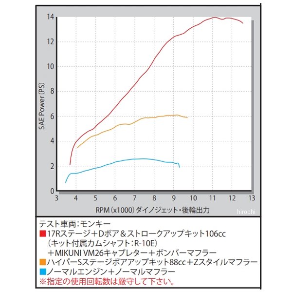 SP武川 17R-Stage+Dボア&ボアストロークアップ97年-02年 ホンダ CL5098年-07年 ホンダ ゴリラ95年-99年 ホンダ ダックス96年-07年 ホンダ ベンリィ50S93年-07年 ホンダ ベンリィCD5095年-07年 ホンダ マグナフィフティー92年-97年 ホンダ モンキー99年-08年 ホンダ モンキー91年-01年 ホンダ モンキーBAJA87年 ホンダ モンキーR88年 ホンダ モンキーRT・17Rステージ+Dシリンダーヘッドノーマルヘッド形状をベースに大径バルブ インテーク:26mm/エキゾースト:22.5mm を採用。(12Vモンキーノーマルバルブ径はインテーク:19mm/エキゾースト:16mm)大径バルブに併せて、最適なバルブ挟み角、燃焼室形状、ポート形状を採用したSP武川オリジナルのシリンダーヘッドです。ノーマルヘッドのポート径は、インテーク/エキゾースト共に14mmであるのに対し、17Rステージのポート径はインテーク:24.5mm/エキゾースト:19mmと大径化。又、3次元ポート形状を採用し、バルブ・ポートの大径化と相まって、より多くの吸排気ガスをスムーズに流す事を可能としています。バルブ:(インテーク26mm/エキゾースト22.5mm バルブステムシャフト径4.5mm)バルブの大径化により、増加する重量をステムシャフトの細軸化とウエスト加工により、最小限の重量増加に留めています。バルブスプリング:最適なスプリングレートの不等ピッチ(2段ピッチ)シングルバルブスプリングを採用し、高回転時のサージングを抑えます。・オートデコンプレッションカムシャフトオートデコンプレッション機能:高圧縮、排気量アップエンジン車でも、軽いキック力でエンジン始動が可能。カムシャフトはR-10E / R-15E / R-20Eの3種類あり、使用用途に合わせて交換し、走行性能を楽しむことが出来ます。88cc / スカット106cc / 106ccキット付属カムシャフト:R-10E・φ52Hシリンダー(アルミ製鉄スリーブシリンダー)・ピストンカブ系エンジン純正シリンダーと外観上は同デザイン(シリンダーの高さは異なる)です。シリンダー側面にはM5温度センサーの接続が可能となり、別途SP武川製コンパクトLCDメーター(M5温度センサー付き)、又はサーモメーターのセンサー部分をM5温度センサーに変更することでシリンダー温度の計測が出来ます。ピストンはスカート部に初期馴染みを良好にするモリブデンコートが施されています。・強化クランクシャフト(2点支持クランクシャフト)X断面形状コンロッド採用鍛造材を削り出し、X断面形状を採用。軽量化と共に充分な強度を確保し、座屈応力の拡散とネジれ剛性が大幅に向上します。表面はショット仕上げ。ジャーナル部の強化クランクシャフトのジャーナルベアリングの内径を大きくした特殊ベアリングを採用。これにより、クランクシャフトへの応力が集中するジャーナル部のシャフト径を20mmから22mmにサイズアップすることが可能になり、シャフトの強度アップを図っています。※注意事項17Rステージ+D装着に伴い、エンジン性能を十分に発揮するにはSP武川製キャブレターキット、マフラーの装着が別途必要になります。
