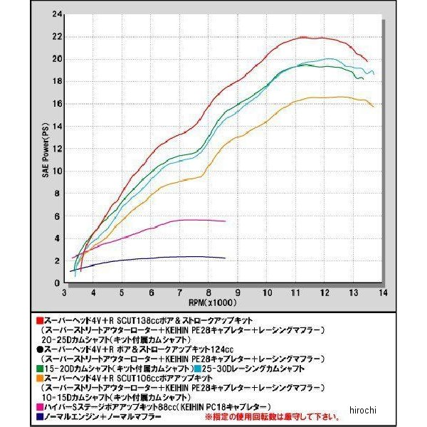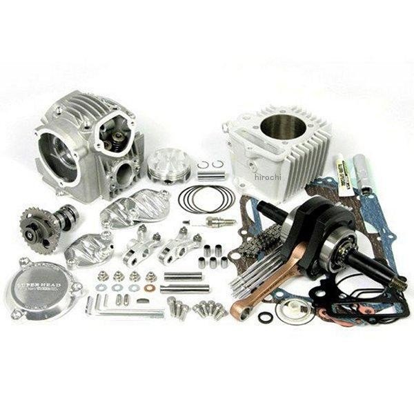 SP武川 スーパーヘッド4バルブ+Rボアストロークアップキット138cc98年-07年 ホンダ ゴリラ92年-97年 ホンダ モンキー99年-08年 ホンダ モンキーSCUT138cc 2点支持クランクシャフトボア径:57mmストローク量:54mm圧縮比:12.6:1付属カムシャフト:20/25Dクランクケース加工不要【スーパーヘッド4V+R(1カム4バルブ)の特徴】SP武川製スーパーヘッド+Rの大口径2バルブに比べ、インテークバルブとエキゾーストバルブを各2本ずつにすることで、バルブカーテン面積を更に拡大することが出来、大口径2バルブ以上に吸排気効率を高める事を可能としました。又、4バルブ化に伴う、センタープラグ化、バルブ挟み角、燃焼室形状、ポート形状のバランスを図り設計されたヘッド形状の為、高出力化を可能とし、スーパーヘッドの最大の特徴でもある高回転域での持続性のある出力特性を実現しています。1カム4バルブを採用することで可能な限り、軽量とコンパクト化を行うことが出来、同時にSOHCヘッド最強ヘッドとしての性能を凝縮しました。【新形状スーパーヘッド4バルブ+R本体】丸みのあるシリンダーヘッド形状はモンキースタイルによく似合い、車両のカスタムイメージを高めることが出来ます。又、バレル研磨が施されたダイカスト製の各ヘッドカバーがシリンダーヘッドを美しく演出します。