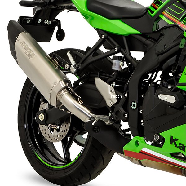 モリワキ BLADE スリップオンマフラー23年以降 カワサキ ZX-25R型式:8BK-ZX250H素材:サイレンサーカバー/チタニウム、エンドキャップ/新世代CFRP音量:近接/93dB、加速/78dB政府認証重量:BLADE/2.0㎏、STD/3.7㎏【性能/PERFORMANCE】Slip-On Exhaust BLADE はSTDのサイレンサーと比較して1.7kg、約46%の軽量化を実現。この軽量化により、ライダーのスマートなライディングをサポートします。発進後、5000rpm付近からトルクの向上を体感することができ、パワーバンド手前の8000rpm付近~レッドゾーンに至るまで、鋭く加速し続け、トルク&パワーの向上を大きく体感することができます。特性については、低回転からエンジン回転数に比例して滑らかに加速していき、スポーツ走行だけではなく、高回転を使うことの少ない普段の街乗りでも、非常に扱いやすい特性です。【音/SOUND】アイドリング時は低音が効いた厚みのある音質で、回転を上げていくと高鳴るエンジン音と共に、躍動感のある、甲高い高音の効いたサウンドに変化します。特に、10,000rpmを超える高回転域で、より高音の効いた吹け上がりのよいレーシーなサウンドに仕上がっています。【BLADE】伝統と技術の粋を集めた一振。日本の伝統的な武器である「日本刀」からインスピレーションを受け、新たなるエキゾーストが誕生しました。日本刀のような崇高な精神を宿し、職人の技で研ぎ澄まされ、新たな技法で製作される。「BLADE Series」は、伝統と革新の融合を象徴しています。繊細なバランスと強靭な性能が融合したデザインは、速度と美の共存が魅力の一端であり、そのデザインは新たなるチャレンジに重要な武器となるでしょう。※2021-2022モデル (2BK-ZX250H) には不適合です、ご注意ください。