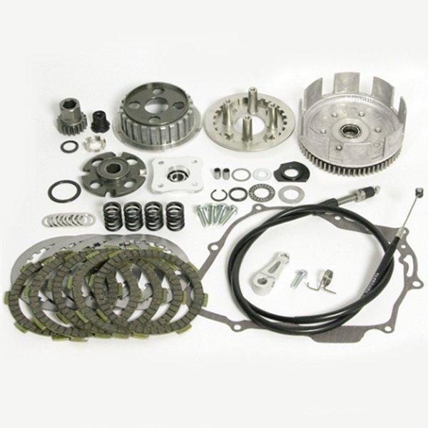 スリッパークラッチスタンダードキットです。・SP武川社製ダイカストクラッチカバーをお持ちの方で、クラッチ一式を購入される方用のキットです。・スリッパークラッチは高回転時のシフトダウンによる急激なエンジンブレーキのショックを緩和させます。・スリッパークラッチは、急激なエンジンブレーキ(バックトルク)が掛かるとクラッチを滑らせ、エンジンブレーキの利きを制御します。これにより、エンジンブレーキによる急激な姿勢変化やリアタイヤのホッピング、エンジンへの負担を減少させることが出来ます。もちろん、通常走行時は従来のスペシャルクラッチと同じ作動をする為、ハイパワーエンジンであってもクラッチが滑る事はありません。・スリッパークラッチの構造クランクシャフトとミッションの間で動力の接続を行うクラッチ部に専用のプレッシャープレートとクラッチカムを設けています。これにより、後輪から伝わったバックトルクがクラッチカムに伝わり、プレッシャープレートのカムとクラッチカムが作動し、プレッシャープレートを押し下げることで半クラッチ状態にし、バックトルクを逃がします。・スリッパークラッチの仕様スペシャルクラッチ同様、ミッションのメインシャフトに取付ける「二次側クラッチ」を採用し、クランクシャフトの負担を軽減します。又、クランクシャフト軸の軽量化も可能となり、軽やかなスロットルレスポンスを発揮します。・プライマリードリブンギアにはダンパーを組み込みクラッチ接続時のショックの低減を図っております。・フリクションディスク数を5枚とし、ストリート及びレースを問わずハイパワーエンジンに対応します。※SP武川社製4・5・6速クロスミッションの同時装着が必要です。78年-90年 ホンダ ゴリラ98年-07年 ホンダ ゴリラ74年-97年 ホンダ モンキー99年-17年 ホンダ モンキー