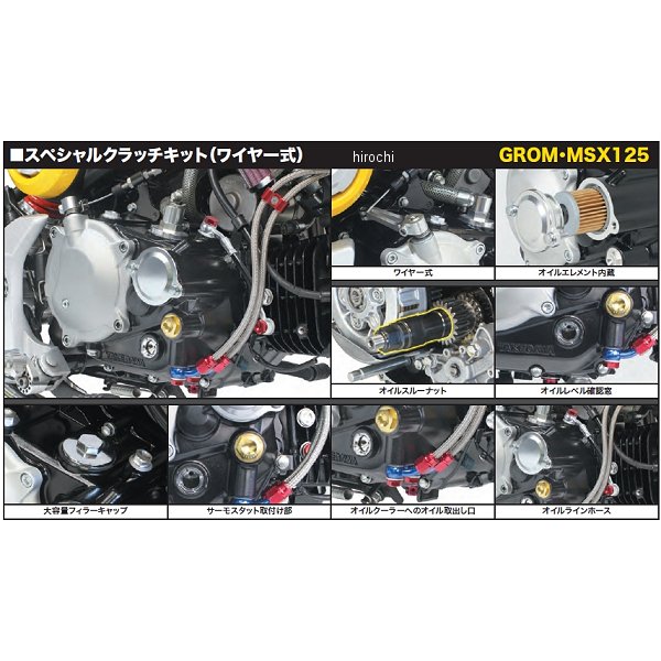 SP武川 スペシャルクラッチカバーキット13年-15年 ホンダ MSX12516年 ホンダ グロム SF13年-15年 ホンダ グロム17年-20年 ホンダ グロム16年 ホンダ グロムMSX125SF【スペシャルクラッチカバー詳細】・アルミ鍛造クラッチカバー(ワイヤー式):ワイヤー式クラッチは、軽くスムーズな操作で定評のあるラック&ピニオン方式を採用。カバーはアルミ鍛造製を採用し、表面にはショットブラストを施しています。・アルミダイカスト製R.クランクケースカバー:カバー表面はブラック塗装を施しています。カバーはノーマルクラッチ、SP武川社製スリッパークラッチ、SP武川社製強化クラッチ(湿式/乾式)に対応。クラッチカバー購入後、強化クラッチ(湿式/乾式)にバージョンアップが可能です。・オイルエレメント内蔵:オイル内にあるスラッジや金属摩耗粉などの不純物をろ過します。オイル内の不純物を除去することで、エンジン出力の維持が可能になります。オイルエレメントは信頼性の高い、カートリッジ式ペーパータイプを採用。・オイルスルーナット:装着することで、大幅な軽量化が可能。遠心オイルフィルター約1069g → オイルスルーナット約123g。付属のオイルスルーナットに交換することで、クランクシャフトに負担をかけるノーマル遠心オイルフィルターを取外すことが出来ます。これにより、クランクシャフトにかかる重量を約1069gから約123gに変更出来、大幅な軽量化が可能になります。又、クランクシャフトへの負担が軽減されることで、エンジンレスポン スが向上します。オイルスルーナットの取付けにより、クランクシャフトへと繋がるオイルラインになります。オイルエレメントを通る為、いつも綺麗なオイルがクランクシャフトへ流れます。・オイルレベル確認窓:オイル量の確認が簡単に行えます。エンジンオイル確認窓には耐久性のあるガラスを採用。・大型フィラーキャップ:アルミダイカスト製クロムメッキ仕上げ 注油口を大きくすることでオイル交換が容易に行えます。・オイル取出し口:カバー本体より直接オイルクーラーへのオイル取出しが行えます。SP武川社には、スペシャルクラッチカバー用のオイルクーラーキットがあります。・特許取得構造:サーモスタット取付け部とオイルライン構造。オイルクーラーキット(スペシャルクラッチカバーからオイルを取出す仕様)を装着された場合に別売サーモスタットユニットを装着することで、オーバークールを防止することが出来ます。・新機構:シリンダーヘッド側に流れるオイルラインをオイルエレメント経由に変更出来る新機構を採用。別売オイルラインホースキットを装着することで、ヘッド側に流れるオイルもオイルエレメントを通過することが出来ます。これにより、オイルスラッジなどによるエンジンダメージを防止します。オイルラインホースを装着するにはSP武川社製ボアアップシリンダー(eステージ除く)にあるオイルクーラーへのオイル取出し口ボスを使用する必要があります。【オプショナルパーツ】・サーモスタットユニット 02-01-5052:カバー本体からオイルクーラーへのオイル取出しを行い、別売のサーモスタットユニットを装着することで、オーバークールを防止することが出来ます。サーモスタットを装着するには、SP武川社製オイルクーラーキットの同時装着が必要です。・ブリーザーキャップ(90度スイベルタイプ) 07-06-0001:ブリーザーキャップを取付けることで、SP武川社製オイルキャッチタンクキット装着時、リターンホースを接続出来ます。・オイルラインホースキット 00-07-0095:オイルラインホースキットを装着することで、ヘッド側に流れるオイルもオイルエレメントを通過することが出来ます。これにより、オイルスラッジなどによるエンジンダメージを防止します。オイルラインホースを装着するにはSP武川社製ボアアップシリンダー(eステージ除く)にあるオイルクーラーへのオイル取出し口ボスを使用する必要があります。・コンパクトクールキット(スペシャルクラッチカバー用):カバーにあるオイル取出し口を使用し、オイルクーラーを取付けます。オイルクーラー本体の取付け位置により、キットが異なります。SP武川社製ビッグスロットルボディーとエアフィルターキット装着し、シュラウドステーにオイルクーラー本体を取付ける場合、ノーマルシリンダーヘッド下にオイルクーラー本体を取付ける場合、SP武川社製スーパーヘッド4V+Rヘッド下にオイルクーラー本体を取付ける場合の3種類があります。パッケージサイズ: 高さ370g x 幅210g x 奥行135g