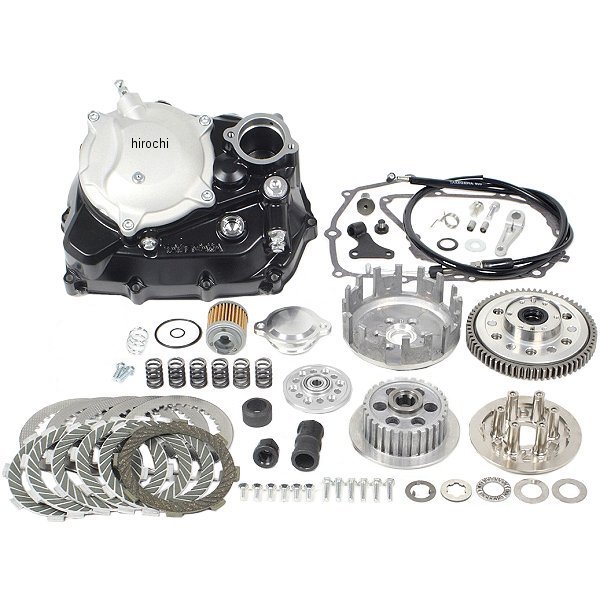 SP武川 スペシャルクラッチキット13年-15年 ホンダ MSX12516年 ホンダ グロム SF13年-15年 ホンダ グロム17年-20年 ホンダ グロム16年 ホンダ グロムMSX125SFタイプRスリッパー無し兼用のR.クランクケースカバーを採用:湿式と乾式、共通のR.クランクケースカバー形状を採用しており、購入後の湿式と乾式双方の仕様変更が可能です。クラッチ部は別室構造になっており、湿式クラッチの場合エンジンオイルとクラッチのオイルを分けることが出来ます。乾式クラッチ用カバーには大きめのベンチレーションホールを設けており、冷却効果を高めております。湿式クラッチから乾式クラッチに変更する場合、フリクションディスクの交換とクラッチ部のオイルを抜くだけの最小変更で乾式クラッチとして使用することができます。クラッチカバーはそのまま使用することも可能ですが、乾式用クラッチカバーを別途ご購入頂くことで冷却効果を高めることが出来、乾式特有のサウンドをお楽しみ頂けます。乾式クラッチから湿式クラッチに変更する場合は乾式用クラッチカバーの購入が必要になります。アルミ鍛造製クラッチカバー:カバーはアルミ鍛造製ショット仕上げ。軽くスムーズな操作のラック&ピニオン方式を採用大型オイルフィラーキャップを採用:純正よりも注油口を大きくし、オイルの注入が容易に行えます。キャップはアルミダイカスト製クロムメッキ仕上げオイルキャッチタンクキットの装着車はブリーザーキャップ(90度スイベル)をご購入頂くことで、リターンホースの接続が可能オイルエレメント:ろ過能力に優れたカートリッジ式ペーパータイプを採用オイルスルーナット:カバー装着に伴い純正遠心オイルフィルターは付属のオイルスルーナットに変更となり、大幅な軽量化を実現。純正遠心オイルフィルター(約1069g)→オイルスルーナット(約123g)これによりクランクシャフトへの負担が軽減され、エンジンレスポンスが向上します。またクランクシャフトへと繋がるオイルラインとなり、エレメント経由となる為、ろ過されたオイルがクランクシャフトに流れます。オイルレベル確認窓付きオイル取出し口を装備:カバーより直接オイルクーラーへのオイル取出しが行えます。SP武川社にはスペシャルクラッチカバー用オイルクーラーキットをご用意しております。特許取得構造(サーモスタットユニット取付け部とオイルライン構造):カバーにはサーモスタットユニットの取付けが出来、オイルクーラー装着時のオーバークールの防止が可能になります。オイルラインホースの接続が可能:別売のオイルラインホースの取付けにより、ヘッド側に流れるオイルをオイルエレメント経由にすることが出来ます。