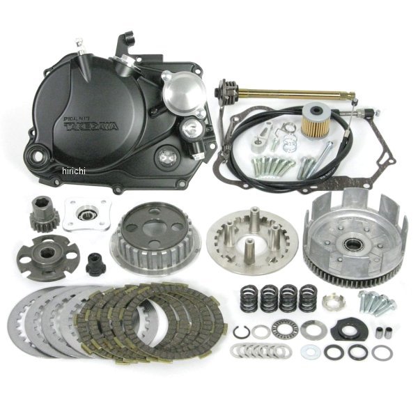 SP武川 SPLクラッチ ホンダ CRF50F適合:CRF50F、CRF70Fカラー:スリッパ―/ブラック・アルミニウムダイカストクラッチカバー(ブラック塗装)特許取得構造:サーモスタット取付け部とオイルライン構造。クラッチカバーはアルミニウムダイカストを採用。表面処理はブラック塗装仕上げ。オイルクーラーへのオイル取出しが可能。オプションで形状記憶合金スプリングを使用したサーモスタットユニットの取付が可能。オーバークールを防止します。サーモスタットユニットは別売です。オイルエレメントには信頼性の高い、カートリッジ式ペーパータイプを採用。エンジンオイル確認窓には耐久性のあるガラスを採用。カバー一体式のクラッチケーブルレシーバーを採用。・スリッパークラッチスリッパークラッチは、急激なエンジンブレーキ(バックトルク)が掛かるとクラッチを滑らせ、エンジンブレーキの利きを制御します。これにより、エンジンブレーキによる急激な姿勢変化やリアタイヤのホッピング、エンジンへの負担を減少させることが出来ます。もちろん、通常走行時は従来のスペシャルクラッチと同じ作動をする為、ハイパワーエンジンであってもクラッチが滑る事はありません。スリッパークラッチの構造。クランクシャフトとミッションの間で動力の接続を行うクラッチ部に専用のプレッシャープレートとクラッチカムを設けています。これにより、後輪から伝わったバックトルクがクラッチカムに伝わり、プレッシャープレートのカムとクラッチカムが作動し、プレッシャープレートを押し下げることで半クラッチ状態にし、バックトルクを逃がします。スリッパークラッチの仕様スタンダードクラッチ同様、ミッションのメインシャフトに取付ける“二次側クラッチ”を採用し、クランクシャフトの負担を軽減します。又、クランクシャフト軸の軽量化も可能となり、軽やかなスロットルレスポンスを発揮します。プライマリードリブンギアにはダンパーを組み込みクラッチ接続時のショックの低減を図っております。フリクションディスク数を5枚とし、ストリート及びレースを問わずハイパワーエンジンに対応します。アルミ削り出しリフタープレートを採用。※注意事項3速クロスレシオギア、又は4速クロスミッションキットとクラッチレバーASSY.の同時装着が必要です。CRF50F/XR50Rの場合、トップブリッジ、ノーマルハンドルを交換し、φ22.2のハンドルパイプに変更する必要があります。SP武川ではφ22.2ハンドルパイプ変換用トップブリッジの販売は行っておりません。φ22.2ハンドルパイプは販売しております。XR70R フレームNO:DE02-1299999までは、部品が異なる為使用不可。フュ-エルタンク及び前後フェンダーが白色のモデルです。
