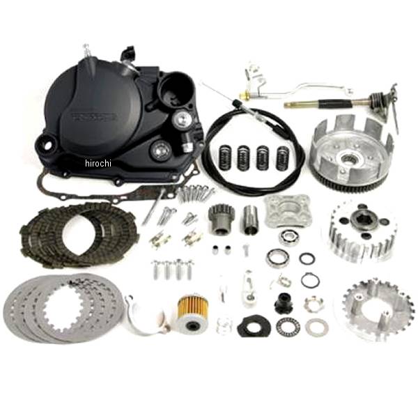 SP武川 SPLクラッチ ホンダ CRF50、70F適合:ホンダ CRF50F、CRF70Fカラー:アルミ/ブラック・アルミニウムダイカストクラッチカバー(ブラック塗装)特許取得構造:サーモスタット取付け部とオイルライン構造。クラッチカバーはアルミニウムダイカストを採用。表面処理はブラック塗装仕上げ。オイルクーラーへのオイル取出しが可能。オプションで形状記憶合金スプリングを使用したサーモスタットユニットの取付が可能。オーバークールを防止します。サーモスタットユニットは別売です。オイルエレメントには信頼性の高い、カートリッジ式ペーパータイプを採用。エンジンオイル確認窓には耐久性のあるガラスを採用。カバー一体式のクラッチケーブルレシーバーを採用。・スタンダードクラッチ(ノーマルメインシャフト用)ノーマルメインシャフト用は特許取得構造のアダプターを使用することで、ノーマルメインシャフトのまま二次側クラッチに変更することが出来ます。これにより、クランクシャフトの負担を軽減する事が出来ます。又、クランクシャフト軸の軽量化も可能となり、軽やかなスロットルレスポンスを発揮します。プライマリードリブンギアにはダンパーを組み込みクラッチ接続時のショックの低減を図っております。フリクションディスク数を5枚とし、ストリート及びレースを問わずハイパワーエンジンに対応させています。耐久性及び強度の高いアルミダイカスト製リフタープレートを採用。※注意事項ノーマルメインシャフト専用品です。クロスミッション装着車は取付け出来ません。CRF50F/XR50Rの場合、トップブリッジ、ノーマルハンドルを交換し、φ22.2のハンドルパイプに変更する必要があります。SP武川ではφ22.2ハンドルパイプ変換用トップブリッジの販売は行っておりません。φ22.2ハンドルパイプは販売しております。XR70R フレームNO:DE02-1299999までは、部品が異なる為使用不可。フュ-エルタンク及び前後フェンダーが白色のモデルです。