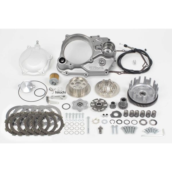 SP武川 スペシャルクラッチキットTYPE-R ワイヤー式/シルバー塗装 6Vモンキー/ゴリラ(Z50J-1300017 ~1805927)12Vモンキー(Z50J-2000001~/AB27-1000001~1899999)12Vゴリラ(Z50J-2500001~/AB27-1000001~1899999)モンキー(FI)(AB27-1900001~) Benly CD50(CD50-2500001~)Benly CD50S(CD50-220005~)CD50(CD50-2000001~)・回転マス重量を軽減しつつ、6ディスク化によりクラッチ容量アップを実現します。・SP武川製WET対応クロスミッション装着車用。車両により、弊社クロスミッションキットが異なります。ご注意下さい。・このキットはスリッパークラッチ仕様になります。・右クランクケースカバーにはアルミダイカスト製を採用。・カバー表面にはシルバー塗装が施されています。・湿式クラッチと乾式クラッチのどちらにも使用出来る右クランクケースカバー形状を採用。・スペシャルクラッチ(湿式)購入後も乾式クラッチへ仕様変更が出来ます。※仕様変更には、弊社指定パーツの別途購入が必要です。・アルミ鍛造クラッチカバー(ワイヤー式)。ワイヤー式クラッチは、軽くスムーズな操作で定評のあるラック&ピニオン方式を採用。カバーはアルミ鍛造を採用し、表面にはショットブラストを施しています。スペシャルクラッチ装着後でもクラッチカバーを外すことで、クラッチスプリング、クラッチプレート、クラッチフリクションディスクの交換が容易に行えます。※必ず、デコンプレッション機能付きボアアップキットと併用して頂く必要があります。(弊社製デスモヘッドは除く)※弊社製WET対応クロスミッションの同時装着が必要です。※モンキー・ゴリラ(Z50J-1300017~1600007)の車両に取付ける場合・付属のクラッチケーブルがノーマルクラッチホルダーに対応していない為、ハンドルパイプを交換し、弊社製クラッチレバー、又はクラッチレバー付きコンビネーションスイッチをご使用下さい。 ノーマルマフラー、アップマフラーの同時装着は出来ません。※Benly CL50に取り付ける場合・本キットに付属のクラッチケーブル(850mm)では長さが足りません。(ノーマルハンドル時) 別途クラッチケーブル(910mm)の購入が必要になります。又、ノーマルアップマフラーのフロントステーナットが干渉する為、エンジンマウントボルトの差込み方向を逆にして頂く必要があります。ノーマルアップマフラーを装着するには、マフラーの中間にあるエンジンマウント部のステーを切除する必要があります。