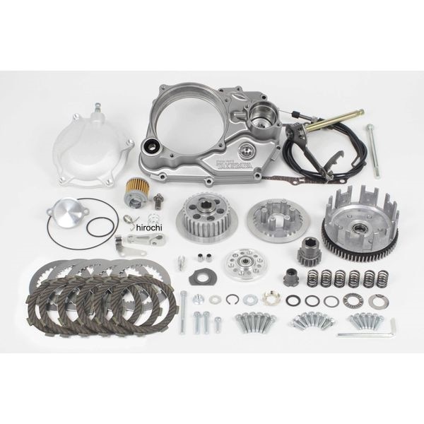 SP武川 スペシャルクラッチキット TYPE-R ワイヤー式/シルバー塗装 12V DAX50(AB26-1000001~)※SP武川製クロスミッションの同時装着が必要になります。・アルミダイカスト製右クランクケースカバーにアルミ鍛造クラッチカバーを採用。・スリッパークラッチ無し・兼用の右クランクケースカバーを採用。WET(湿式)とDRY(乾式)、共通の右クランクケースカバー形状を採用しており、購入後の湿式と乾式双方の仕様変更が可能です。※仕様変更にはSP武川指定部品の別途購入が必要になります。※スリッパークラッチはバックトルクを完全に逃がす事は出来ません。一部はクランクシャフトに伝達しますので、高回転での急激なシフトダウンはエンジンの破損につながるので行わないで下さい。※スリッパークラッチは構造上、エンジン始動時、クラッチに滑りが発生しますので、必ずオートデコンプレッション機能付きカムシャフトをご使用下さい。※SP武川製オイルクーラーを使用し、クラッチカバーにオイルホースを接続している場合はバンジョー、ホース長の変更が必要になります。※ノーマルマフラー、アップマフラーの同時装着は出来ません。※12V DAX50は、付属のクラッチマスターシリンダーを取付ける場合、ノーマルクラッチレバー&ホルダーを取外す必要がある為、SP武川製モンキー用コンビネーションスイッチ(05-09-0028)の別途購入が必要。(配線加工有) ※対象ミッション(ノーマルメインシャフト用、又はSP武川製クロスミッション用)以外の車両には取付け出来ません。
