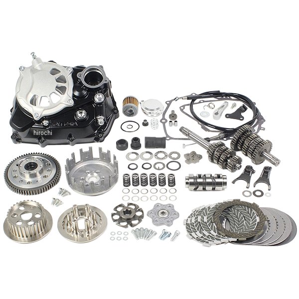 SP武川 乾式クラッチ タイプ-R & TAF5速クロスミッションキット13年-15年 ホンダ MSX12516年 ホンダ グロム SF13年-15年 ホンダ グロム16年 ホンダ グロムMSX125SFスリッパー有り【スペシャル/乾式クラッチインナーキット タイプR(6ディスク) 詳細】・クラッチアウターなどの回転部分を小径化する事でオイル拡散によるロス馬力の減少や、更なるレスポンスの向上と回転マス重量の軽減を実現し、エンジンパワーを無駄無く伝達します。・ケブラー配合フリクションディスク5枚と、ジャダーフリクションディスク1枚使用による6ディスク化を実現。これにより発進時のジャダーを軽減すると同時にクラッチ容量がアップし、ハイパワーエンジンに対応します。・またクラッチユニットは湿式・乾式共通とすることで、双方の仕様変更が可能です。(湿式クラッチから乾式クラッチに変更する場合、フリクションディスクの交換が必要になりますが、乾式クラッチから湿式クラッチに変更する場合はそのままご使用頂けます。(※消耗品の交換が無い場合に限ります。またクラッチカバー等は別途必要。)【クラッチの構造はスリッパークラッチの有無で2種類設定】:スリッパークラッチは高回転時のシフトダウンによる急激なエンジンブレーキのショックを緩和します。これにより、急激な姿勢変化やリアタイヤのホッピング、エンジンへの負担を減少することが出来ます。(スリッパークラッチの詳細は上記参照)【ダンパー内蔵プライマリドリブンギア】:クラッチ接続時、ギア等のショック軽減を図り、ラバーダンパーを内蔵【クラッチスプリング】:耐疲労性に優れ、安定したクラッチフィールを実現スペシャル/乾式クラッチインナーキット タイプRの装着には専用のTAF5速クロスミッションキットの同時 装着が必須です。ノーマルミッションのままでは取付け出来ません。【TAF5速クロスミッション(スペシャル/乾式クラッチインナーキット タイプR専用) 詳細】・エンジンのパワーバンドをキープしながらスムーズに加速することが出来ます。・SP武川製ボアアップキットを装着した場合にもトルクフルな出力特性をそのままにご使用頂けます。・各ギアの移動量はショートストローク化することで歯幅を確保し、耐久性を向上しております。【ギアレシオ】・ノーマルミッション:1速:2.500 2速:1.550 3速:1.150 4速:0.923・TAF5速クロスミッション: 1速:2.333 2速:1.684 3速:1.272 4速:1.040 5速:0.923TAF5速クロスミッションの装着に伴い、スピードメーターの表示に誤差が生じます。補正には純正メーター用スピードセンサーキットをご使用下さい。(使用されるキャリパーブラケットにより製品が異なります。)スペシャルクラッチインナーキットタイプR専用です。ノーマルクラッチとの同時装着は出来ません。先に販売しておりますノーマルクラッチ用スペシャルクラッチカバーやノーマルクラッチ用TAF5速クロスミッションを装着されている車両から、スペシャルクラッチ・乾式クラッチ タイプRにバージョンアップする場合は下記必要部品をご購入下さい【ノーマルクラッチ用スペシャルクラッチカバーキット(02-01-0150)装着の場合】・スペシャルクラッチキット(湿式) タイプR/乾式クラッチキット TYPE-Rにバージョンアップする場合の購入部品(共通)・スペシャル/乾式クラッチインナーキット タイプR(スリッパー有り) 02-02-0083 ※(1)(2)のいずれかをお選び下さい・スペシャル/乾式クラッチインナーキット タイプR(スリッパー無し) 02-02-0081 ※(1)(2)のいずれかをお選び下さい・セパレーターキット 02-02-0125 ※セパレーターキットの装着には特殊工具が必要になります。・TAF5速クロスミッションキット(スペシャル・乾式クラッチタイプR専用) 02-04-0295スペシャルクラッチキット(湿式) タイプR/乾式クラッチキット タイプRにバージョンアップする場合の購入部品(共通)乾式クラッチキット タイプRに変更する場合、上記に加えクラッチカバーキット(ワイヤー式/乾式タイプ)02-02-0126の購入が必要になります。スペシャルクラッチカバーのままでも乾式クラッチ仕様でお使い頂けますが、冷却効果の高い乾式用クラッチカバーのご購入をお薦めします。【ノーマルクラッチ用TAF5速クロスミッションキット(02-04-0293)装着の場合】・ご使用のミッションを、スペシャル/乾式クラッチインナーキットに対応する為の必要部品で構成した「TAF5速クロスミッション変換キット(02-04-0296)」をご購入頂く事で、スペシャルクラッチキット タイプR(又は乾式クラッチキットタイプR)を取付けることが出来ます。