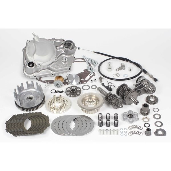 SP武川 スペシャルクラッチTYPE-R スリッパー+TAF5速 スーパーストリート モンキー(FI)(AB27-1900001~)・本製品はカスタムエンジンの出力を確実に伝達するスペシャルクラッチ TYPE-Rとパワーバンドを有効に使用出来るクロスミッションがセットになっています。・TYPE-R仕様は回転マス重量を軽減しつつ、6ディスク化によりクラッチ容量アップを実現します。・兼用の右クランクケースカバーを採用。・右クランクケースカバーにはアルミダイカスト製を採用。・カバー表面はシルバー塗装が施されています。・湿式クラッチ、乾式クラッチのどちらにも使用出来る右クランクケースカバー形状を採用。・乾式クラッチ購入後もスペシャルクラッチ(湿式)へ仕様変更出来ます。※仕様変更はSP武川指定パーツの別途購入が必要です。・アルミ鍛造クラッチカバー(ワイヤー式)・ワイヤー式クラッチは、軽くスムーズな操作で定評のあるラック&ピニオン方式を採用。・カバーはアルミ鍛造を採用し、表面にはショットブラストを施しています。・スペシャルクラッチ装着後でもクラッチカバーを外すことで、クラッチスプリング、クラッチプレート、クラッチフリクションディスクの交換が容易に行えます。※スリッパークラッチはバックトルクを完全に逃がす事は出来ません。一部はクランクシャフトに伝達しますので、高回転での急激なシフトダウンはエンジンの破損につながるので行わないで下さい。※ノーマルマフラー、アップマフラーの同時装着は出来ません。