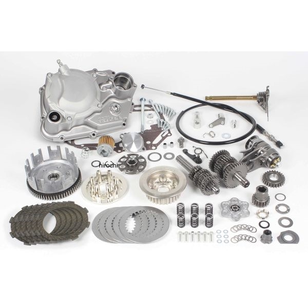 SP武川 スペシャルクラッチTYPE-R スリッパー+TAF5速 スーパーストリート 12V DAX50(AB26-1000001~)・本製品はカスタムエンジンの出力を確実に伝達するスペシャルクラッチ TYPE-Rとパワーバンドを有効に使用出来るクロスミッションがセットになっています。・装着に伴い、マニュアルクラッチになります。・TYPE-R仕様は回転マス重量を軽減しつつ、6ディスク化によりクラッチ容量アップを実現します。・兼用の右クランクケースカバーを採用。・右クランクケースカバーにはアルミダイカスト製を採用。・カバー表面はシルバー塗装が施されています。・湿式クラッチ、乾式クラッチのどちらにも使用出来る右クランクケースカバー形状を採用。・乾式クラッチ購入後もスペシャルクラッチ(湿式)へ仕様変更出来ます。※仕様変更はSP武川指定パーツの別途購入が必要です。・アルミ鍛造クラッチカバー(ワイヤー式)・ワイヤー式クラッチは、軽くスムーズな操作で定評のあるラック&ピニオン方式を採用。・カバーはアルミ鍛造を採用し、表面にはショットブラストを施しています。・スペシャルクラッチ装着後でもクラッチカバーを外すことで、クラッチスプリング、クラッチプレート、クラッチフリクションディスクの交換が容易に行えます。※必ず、デコンプレッション機能付きボアアップキットと併用して頂く必要があります。(SP武川製デスモヘッドは除く)※スリッパークラッチはバックトルクを完全に逃がす事は出来ません。一部はクランクシャフトに伝達しますので、高回転での急激なシフトダウンはエンジンの破損につながるので行わないで下さい。※ノーマルマフラー、アップマフラーの同時装着は出来ません。