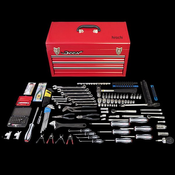 ディーン DEEN インチ Proツールセット レッドハーレー及びインチ仕様の機械・車両【外寸】全幅:520mm 奥行:255mm 高さ:300mm【内寸】上部スペース 幅:515mm 奥行:250 深さ:45mm引出し1.2段目 幅:447mm 奥行:218 高さ:40mm引出し3段目 幅:447mm 奥行:218 高さ:55mmカラー:ツールボックス本体:レッド【セット内容】3段トップチェストケース×1個3/8sq ラチェットハンドル×1本3/8sq ユニバーサルボールジョイント×1個3/8sq エクステンションバー75mm×1本3/8sq エクステンションバー150mm×1本3/8sq 12角ソケット11pcs×1セット3/8sq ヘキサゴンソケットビット各種×4個3/8sq トルクスソケットビット9pcs×1セットインチコンビネーションレンチ7pcs×1セットL型トルクスレンチ9pcs×1セットL型ヘックスレンチ13pcs(BONDHUS)×1セット貫通プラス・マイナスドライバー各種×6本ピック&フックツール4pcs×1セットコンビネーションハンマー×1本モンキーレンチ250mm×1本ウォーターポンププライヤー250mm×1本ニッパー160mm×1本ラジオペンチ160mm×1本ショートコンビネーションレンチ10mm×1本ショートコンビネーションレンチ8mm×1本SIGNETミニスナップリングプライヤー4pcs×1セット3/8sq 12角ソケット10mm×1個3/8sq 12角ディープソケット3/8in×1個3/8sq 12角ディープソケット7/16in×1個3/8sq スパークプラグソケットTC/XL/M8×1個3/8sq スパークプラグソケットEVO/SHV×1個3/8sq スピンナーハンドル×1本ビットセット52pcs×1セット1/4sq ラチェットハンドル×1本1/4sq ユニバーサルボールジョイント×1個1/4sq 12角ソケット各種×8個1/4sq エクステンションバー75mm×1本1/4sq エクステンションバー150mm×1本1/4sq Ko-ken首振りエクステンションバー150mm×1本スタビラチェットドライバー×1個タガネドライバー×1本KTC コンビネーションレンチ1/4in×1本KTC コンビネーションレンチ5/16in×1本ホースピンチオフ×2個Engineer ネジザウルス×1本Pro-Auto ビットラチェット×1本ANEX ネジすべり止め剤×1本クリップ付き精密マイナスドライバー×1本【特長】Deen製のスペシャルセレクトツールセット、Proバージョンです。ハーレー整備の為に考えた、Deen製のツールボックスに同ツールを中心として、部分的に他ツールブランドも組み合わせた厳選の内容。レッドのツールボックスに、基本のコンビスパナや3/8ドライブのラチェット&ソケット&エクステンション、L型のヘックス&トルクスに各種3/8角ビットも基本サイズをセットに、ミニスナップリングプライヤーやコンビハンマーに加えプライヤー、ドライバーセットも同梱させました。さらに、1/4ドライブのラチェットや1/4対応のソケットセットにエクステンションは狭い箇所にも到達できる便利ツールで、より細かい作業には52pcsビットセットも同梱してあるので安心です。中~上級者向けのベースとなっておりますので、既に手持ちのツールを組み合わせたり、自分好みのセレクトを別購入で揃えていけば、唯一の自分オリジナルセットも完成できます。自分でもカスタムやメンテナンスをしたい。というハーレーオーナーへ向けたインチツールセットを是非お試しください。単品で購入を積み重ねるよりも、グッとお得なツールセットです。中敷きパッドが同梱されてますので、各段に敷いてご使用下さい。持ち運び時には引出しを完全に奥まで閉じて、トップカバーを閉じて下さい。そうすることで引出しが飛び出さないようにロックされます。工具が正しい使用用途、およびトルク管理のもとご使用下さい。ミリサイズなど、近似値ボルトへの代用や、インパクトドライバーでの打撃使用は破損の原因になります。