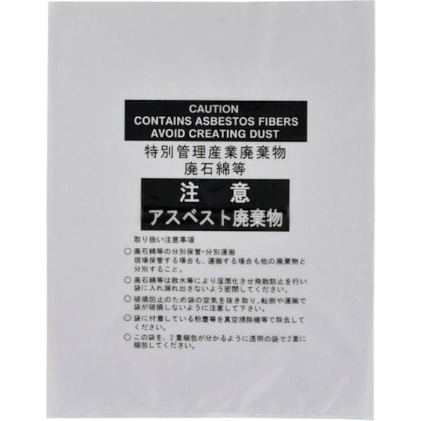 ・別売のアスベスト専用回収袋(黄色)と合わせてご使用ください。・アスベスト専用廃棄物袋との2重梱包に。・色:透明・容量(L):45・縦(mm):850・横(mm):670・厚さ(mm):0.15・セット商品:10枚1組・厚さ:0.15mm・別売専用回収袋(黄色):033120、033122・ポリエチレン・生産国 中国・JANコード 4932134002031・質量 0.780kg・コード:814-8487 ・品目:033123