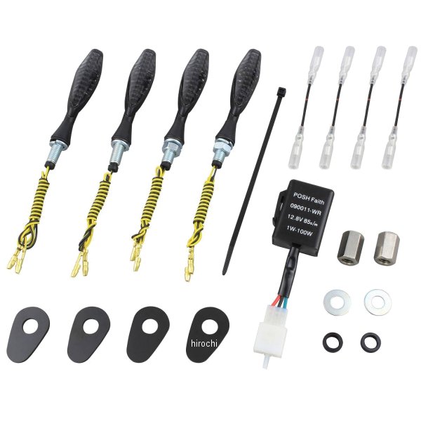 シーケンシャルウインカー本体 4個、高ナット(M8-20mm) 2個、平ワッシャーM8 2枚、スプリングワッシャーM8 4枚、アルミカラーT4 2個、ナット(M8) 2個、変換コード 4本、ワイトワットウインカーリレー 1個、ウインカーステーベース 4枚、タイラップ150 1本
