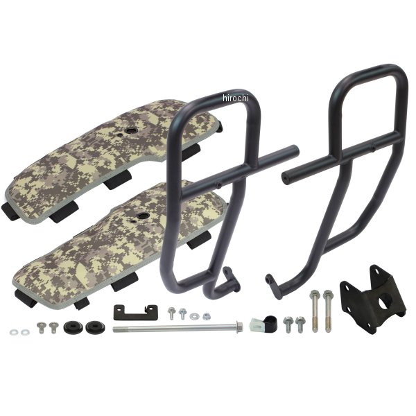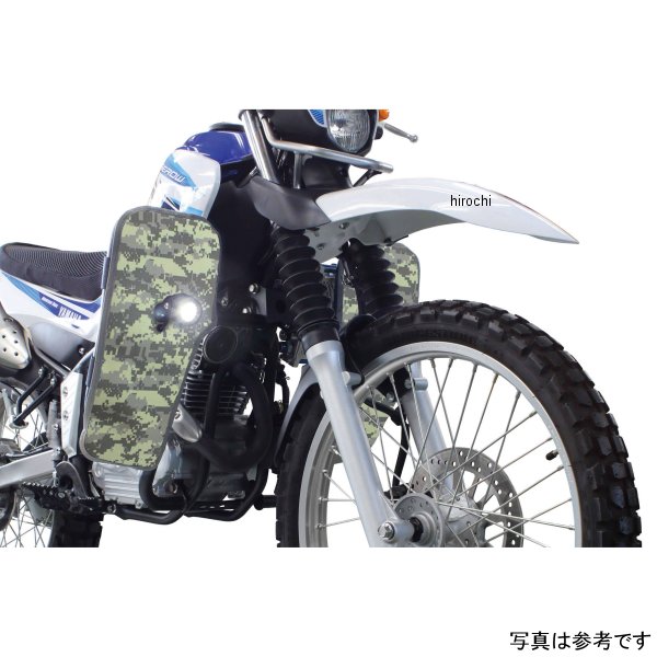 SP武川 レッグバンパー&シールドキット08年-20年 ヤマハ セロー 250カラー:ACU(迷彩)サイドバンパー本体:スチール製パイプブラック塗装仕上げレッグシールド:強化ナイロン製【仕様説明】Φ25.4スチール製パイプを採用した強固なサイドバンパー。本製品の使用により、立ちごけ等の軽度な転倒に対しエンジンやチェンジペダルへのダメージを軽減。付属のレッグシールドをサイドバンパーに装着することで風防効果を得ることが可能。疲労の軽減や、走行中フロントタイヤが巻き上げる水や泥などから自身を守ることが出来ます。レッグシールド(左右)の装着は、裏面にあるベルクロをパイプに巻きつけ、中央にあるボスにスチール製ボルトとアルミ削り出しリテーナーでしっかりと固定します。この固定部分のボスには、フォグランプキット(別売)を装着可能。更にサイドバンパー本体のストレート部分には、アクションカメラやペットボトルホルダー(別売)なども装着可能。※シールドの生地自体には、防水加工は施しておりません。使用する場合は必ず防水スプレーにて防水加工を行い装着してください。