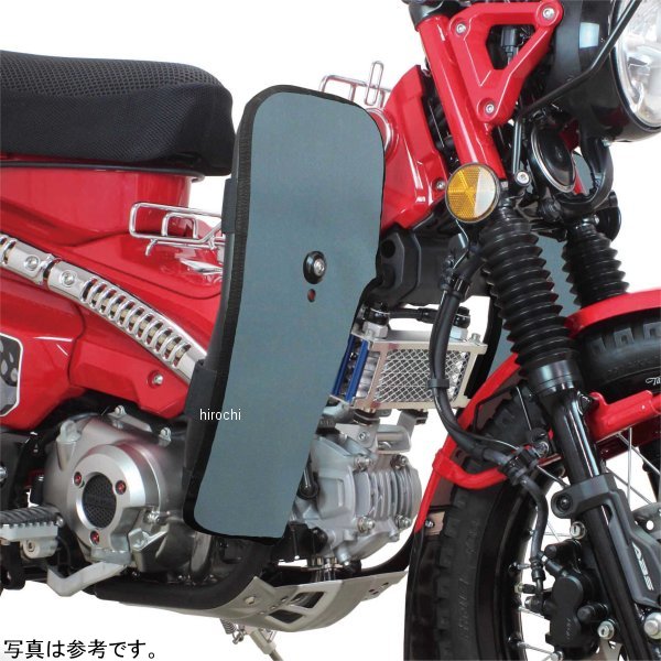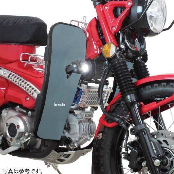 SP武川 レッグバンパー&シールドキット20年-22年 ホンダ ハンターカブ CT125カラー:グレーサイドバンパー本体:スチール製パイプブラック塗装仕上げレッグシールド:強化ナイロン製【仕様説明】φ25.4スチール製パイプを採用した強固なサイドバンパーです。本製品を装着することで、立ちごけ等の軽度な転倒に対し、エンジンやチェンジペダルへのダメージを軽減します。又、付属のレッグシールドをサイドバンパーに装着することで、風防効果を得ることができます。これにより、ライダーの疲労を軽減すると共に走行中、フロントタイヤが巻き上げる水や泥などから自身を守ることが出来ます。レッグシールド(左右)の装着は、裏面にあるベルクロをパイプに巻きつけ、中央にあるボスにスチール製ボルトとアルミ削り出しリテーナーでしっかりと固定します。この固定部分のボスには、フォグランプキット(別売)を装着することができます。更にサイドバンパー本体のストレート部分には、アクションカメラやペットボトルホルダー(別売)なども装着できます。※純正アンダーガードをそのまま使用します。※シールドの生地自体には、防水加工は施しておりません。使用する場合は必ず防水スプレーにて防水加工を行い装着してください。CT125用フォグランプキット(05-08-0502/05-08-0503/05-08-0522/05-08-0523/05-08-0574/05-08-0575)とは干渉する為、同時装着は出来ません。