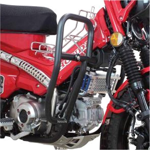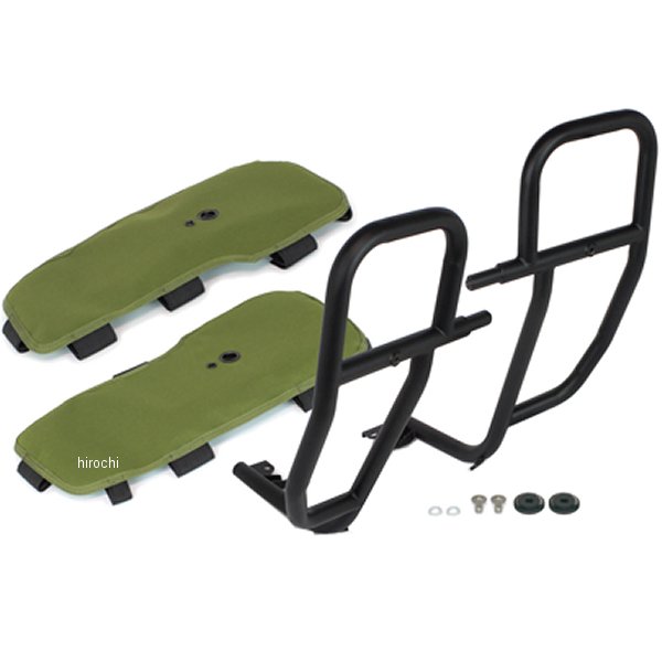 SP武川 レッグバンパー&シールドキット20年-22年 ホンダ ハンターカブ CT125カラー:グリーンサイドバンパー本体:スチール製パイプブラック塗装仕上げレッグシールド:強化ナイロン製【仕様説明】φ25.4スチール製パイプを採用した強固なサイドバンパーです。本製品を装着することで、立ちごけ等の軽度な転倒に対し、エンジンやチェンジペダルへのダメージを軽減します。又、付属のレッグシールドをサイドバンパーに装着することで、風防効果を得ることができます。これにより、ライダーの疲労を軽減すると共に走行中、フロントタイヤが巻き上げる水や泥などから自身を守ることが出来ます。レッグシールド(左右)の装着は、裏面にあるベルクロをパイプに巻きつけ、中央にあるボスにスチール製ボルトとアルミ削り出しリテーナーでしっかりと固定します。この固定部分のボスには、フォグランプキット(別売)を装着することができます。更にサイドバンパー本体のストレート部分には、アクションカメラやペットボトルホルダー(別売)なども装着できます。※純正アンダーガードをそのまま使用します。※シールドの生地自体には、防水加工は施しておりません。使用する場合は必ず防水スプレーにて防水加工を行い装着してください。CT125用フォグランプキット(05-08-0502/05-08-0503/05-08-0522/05-08-0523/05-08-0574/05-08-0575)とは干渉する為、同時装着は出来ません。