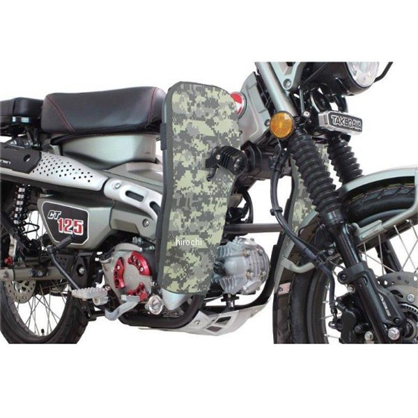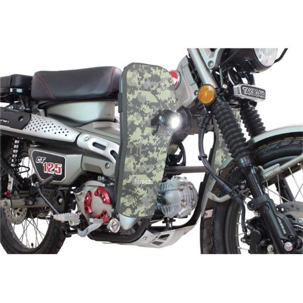 06-00-0050 SP武川 レッグバンパー&シールドキット 23年 ホンダ ハンターカブ CT125カラー:迷彩(ACU)サイドバンパー本体:スチール製パイプブラック塗装仕上げ。レッグシールド:強化ナイロン製【仕様説明】本製品を装着することで、立ちごけ等の軽度な転倒に対し、エンジンやチェンジペダルへのダメージを軽減します。又、付属のレッグシールドをサイドバンパーに装着することで、風防効果を得ることができます。これにより、ライダーの疲労を軽減すると共に走行中、フロントタイヤが巻き上げる水や泥などから自身を守ることが出来ます。レッグシールド(左右)の装着は、裏面にあるベルクロをパイプに巻きつけ、中央にあるボスにスチール製ボルトとアルミ削り出しリテーナーでしっかりと固定します。この固定部分のボスには、フォグランプキット(別売)を装着することができます。更にサイドバンパー本体のストレート部分には、アクションカメラやペットボトルホルダー(別売)なども装着できます。・純正アンダーガードをそのまま使用します。【注意事項】シールドの生地自体には、防水加工は施しておりません。使用する場合は必ず防水スプレーにて防水加工を行い装着してください。ヘッドライトステー装着用フォグランプキットとは干渉する為、同時装着は出来ません。