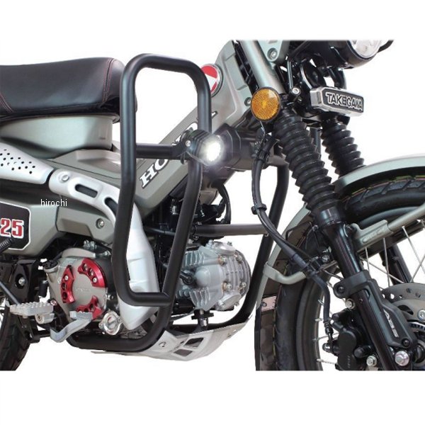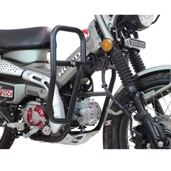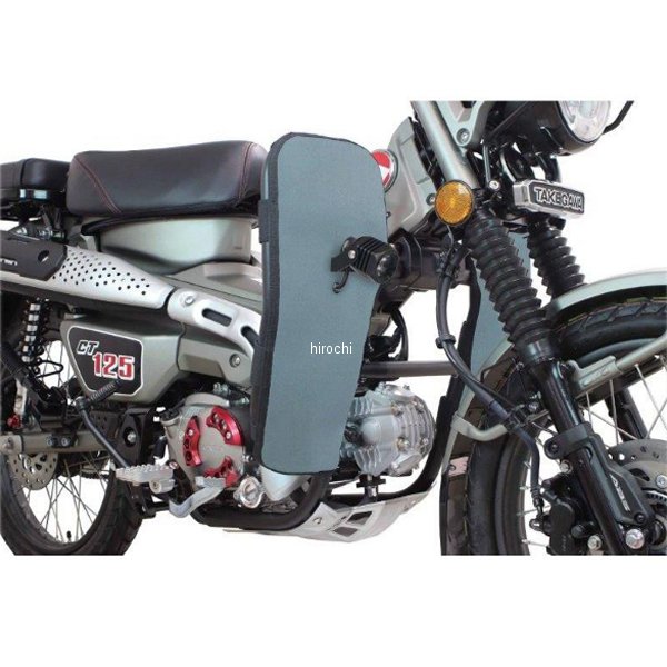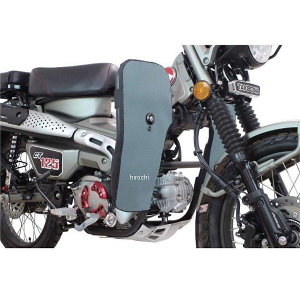 06-00-0051 SP武川 レッグバンパー&シールドキット 23年 ホンダ ハンターカブ CT125カラー:グレーサイドバンパー本体:スチール製パイプブラック塗装仕上げ。レッグシールド:強化ナイロン製【仕様説明】本製品を装着することで、立ちごけ等の軽度な転倒に対し、エンジンやチェンジペダルへのダメージを軽減します。又、付属のレッグシールドをサイドバンパーに装着することで、風防効果を得ることができます。これにより、ライダーの疲労を軽減すると共に走行中、フロントタイヤが巻き上げる水や泥などから自身を守ることが出来ます。レッグシールド(左右)の装着は、裏面にあるベルクロをパイプに巻きつけ、中央にあるボスにスチール製ボルトとアルミ削り出しリテーナーでしっかりと固定します。この固定部分のボスには、フォグランプキット(別売)を装着することができます。更にサイドバンパー本体のストレート部分には、アクションカメラやペットボトルホルダー(別売)なども装着できます。・純正アンダーガードをそのまま使用します。【注意事項】シールドの生地自体には、防水加工は施しておりません。使用する場合は必ず防水スプレーにて防水加工を行い装着してください。ヘッドライトステー装着用フォグランプキットとは干渉する為、同時装着は出来ません。