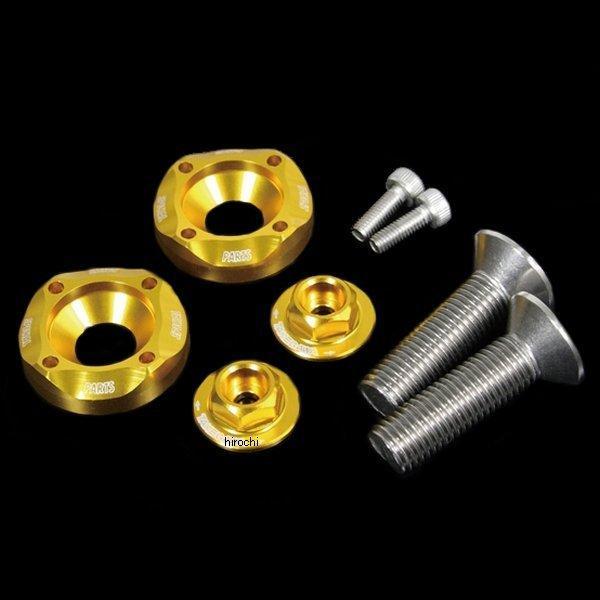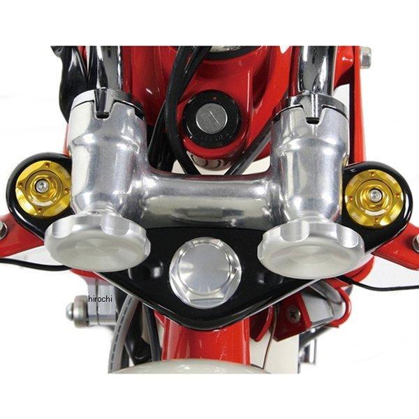 トップボルトセットです。78年-90年 ホンダ ゴリラ98年-07年 ホンダ ゴリラ88年-99年 ホンダ シャリー5081年-87年 ホンダ シャリー7078年-97年 ホンダ モンキー99年-17年 ホンダ モンキーカラー:ゴールド(キャップ/リテーナー同色)2個アルミ削り出しアルマイト処理締め付け用ボルトネジ部:長さ30mmモンキー・ゴリラのノーマルトップブリッジのドレスアップパーツです。イニシャルアジャスターをモチーフとしたデザインはカスタムイメージを高めます。アルミを精巧に削り出し、アルマイトを施すことでトップブリッジ周りを美しく演出します。ノーマルトップボルトと異なり、リテーナー部とキャップ部の色の組み合わせもお楽しみ頂けます。販売のカラーはキャップとリテーナーが同色になります。