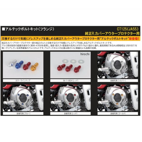 SP武川 アルテックボルトキット20年-25年 ホンダ ハンターカブ CT125カラー:レッド純正R.カバーアウタープロテクター用規格:JISB1057素材:アルミA7050交換するだけで気軽に楽しめる純正R.カバーアウタープロテクター用「アルミテックボルトキット」純正R.カバーアウタープロテクター部の純正ボルトと交換するだけで気軽にドレスアップを楽しめるアルテックボルトキットです。アルミ素材技術の超最先端を行く素材・A7050を使用し、強度・耐久力・腐食割れ性共にA7075-T6より遥かに優れ、最高規格であるAL6規格相当(JISB1057)を唯一クリアしている世界最強のアルミボルトです。アルテックボルトの比重は鉄の1/3と軽量化にも抜群の効果。