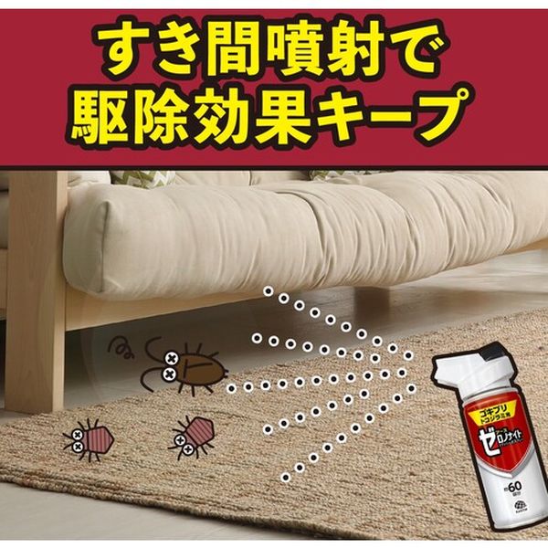 ・1年に1度は徹底ケア!・プッシュするだけ簡単! 気になる場所に、いつでも簡単に使用できます。・赤ちゃん、ペットがいるご家庭でも使用できます。・抵抗性ゴキブリ・スーパートコジラミにしっかり効く。・ゴキブリ・トコジラミ(ナンキンムシ)をまるごと駆除。・ゴキブリ・トコジラミ(ナンキンムシ)の駆除に。・効果持続目安:約1年・効果範囲目安:1.5畳あたりに1回・容量(ml):75・適合害虫:ゴキブリ・トコジラミ・タイプ:1プッシュスプレー式・香り:無香料・ブロフラニリド・イソプロパノール、DME、その他2成分・人体に使用しないこと。・噴射前に噴射口の方向をよく確認して、薬剤が顔などにかからないようにしてください。・薬剤を吸い込まないでください。・万一、身体に異常が起きた場合は、できるだけ本品を持って直ちに本品がメタジアミド系薬剤を含む商品(GABA作動性塩素イオンチャネルに作用)であることを医師に告げて診療を受けてください。・生産国 日本・JANコード 4901080065810・質量 150g・コード:701-8413 ・品目:065810