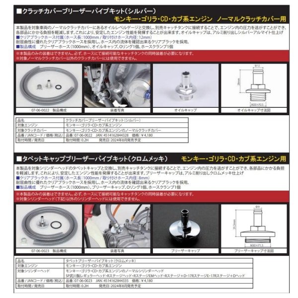 SP武川 タペットキャップブリーザーキットホンダ BAJAホンダ JAZZホンダ カブ 100EXホンダ ゴリラホンダ スーパーカブ 50ホンダ スーパーカブ 70ホンダ スーパーカブ 90ホンダ ダックスホンダ ベンリー 50Sホンダ ベンリー 90Sホンダ ベンリー CD50ホンダ ベンリー CL50ホンダ マグナ 50ホンダ モンキーホンダ モンキー Rホンダ モンキー RTホンダ リトルカブカラー:メッキ※ノーマルシリンダーヘッド用※本製品のみの装着はできません。必ず、ホースにて接続可能なキャッチタンクの同時装着が必要になります。※対象シリンダーヘッド以外のシリンダーヘッドには使用できません。※ロットによっては、価格変更前の旧価格・旧JANコードでのラベルでお届けになる場合がございます。予めご了承ください。※メーカー都合により商品の仕様変更がある場合がございます。ご了承ください。本製品を対象シリンダーヘッドのタペットキャップと交換し、別売キャッチタンクに接続することで、エンジン内の圧力を逃がすことができ、各部品にかかる負担を軽減します。これにより、安定したエンジン性能を発揮することが出来ます。ブリーザーキャップは、アルミ削り出しクロムメッキ仕上げ。■クリアブラックホース付属(ホース長:1000mm/取り付けホース内径:8mm)耐屈曲性に優れたクリアブラックホースを採用し、ホース内の流体を確認出来るクリアブラックを採用。■製品構成 ブリーザーホース(1000mm)、ブリーザーキャップ、Oリング1個、ホースクランプ1個