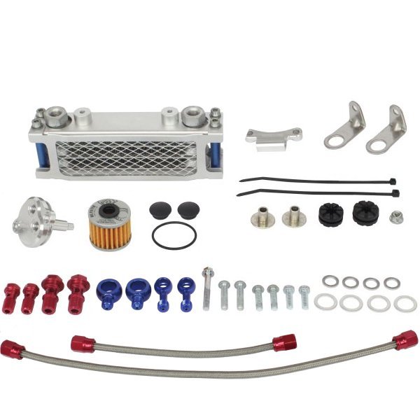 SP武川 コンパクトクールキット スリムラインホース23年-25年 ホンダ ダックス125※ノーマルシリンダーヘッド、ノーマルクラッチカバー専用。タイプ:3フィン4オイルライン【仕様説明】・オイルクーラー本体の取り付け位置ノーマルシリンダーヘッドのタペットカバーに専用の取り付けブラケットを装着し、シリンダーヘッド下にオイルクーラー本体を固定します。・オイル取り出し口純正クラッチカバーのオイルフィルター部に専用のオイルフィルターカバーを装着し、オイルの取り出しを行います。オイルフィルターカバーの内部にはリリーフバルブ機構を備えています。更にネオジウムマグネットを内部に装備している為、エンジンオイルに混じった鉄粉を吸着し、オイルフィルターへの汚れを軽減します。・コンパクトクール本体についてクーラー本体は冷却効果に優れたコンパクトクールを採用。オイルクーラーを取付けることで、エンジンの油温上昇を抑えることが出来ます。オイルクーラープレート、ガードが標準装備。コンパクトクール本体は3フィン4オイルラインと4フィン5オイルラインをラインナップ。※ノーマルシリンダーヘッド、ノーマルクラッチカバー専用です。※フロントマッドガードの取り外しが必要です。※悪路走行やオフロードでの使用は、行わないで下さい。※オイル量は通常規定オイル量に4フィンは約60cc、3フィンは約40ccを追加して下さい。