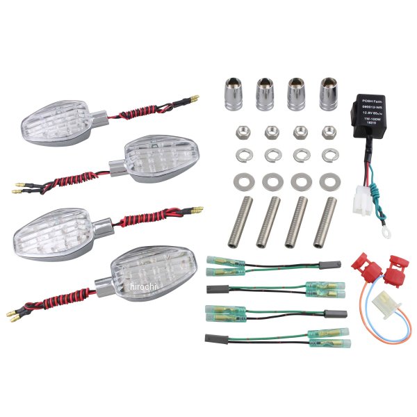 ポッシュ POSH ライトウエイトLEDウインカーセット -98年 スズキ GSX400インパルスカラー:メッキボディ/クリアレンズ【セット内容】・ウインカー本体S球×4個・延長ステー20mm×4本・M10×55スタッドボルト×4本・M10ナット/ワッシャー/Sワッシャー各4個・変換カプラーコード×4本・LED対応ウインカーリレー×1個・リレー変換ハーネス(スズキ)×1個【仕様説明】一台分に必要なパーツを全てパッケージングしました。ポリカーボネートボディ、スリムなデザインのLED内臓ウインカーです。※LED対応ウィンカーリレー・変換カプラーコード付き。※純正リレーの加工が必要です。※インパルスタイプS不可。